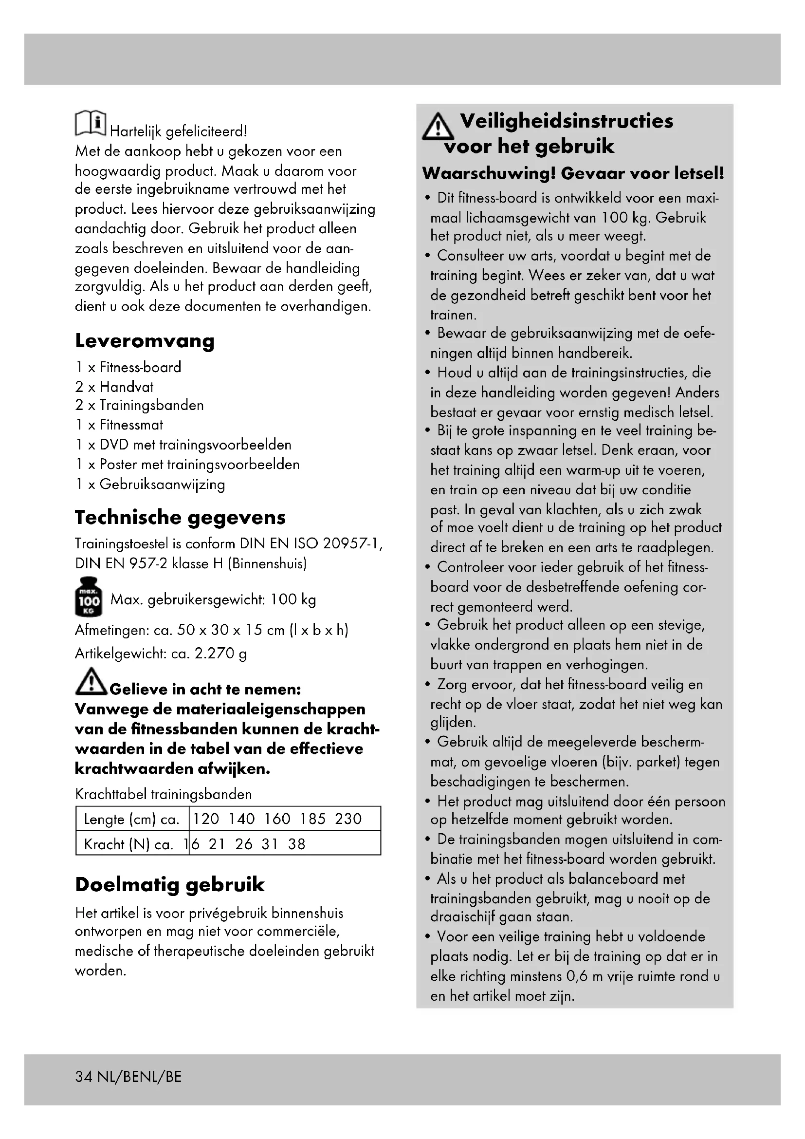 - Dit fitness-board is ontwikkeld voor een maxi- maal lichaamsgewicht van 100 kg. Gebruik het product niet, als u meer weegt.