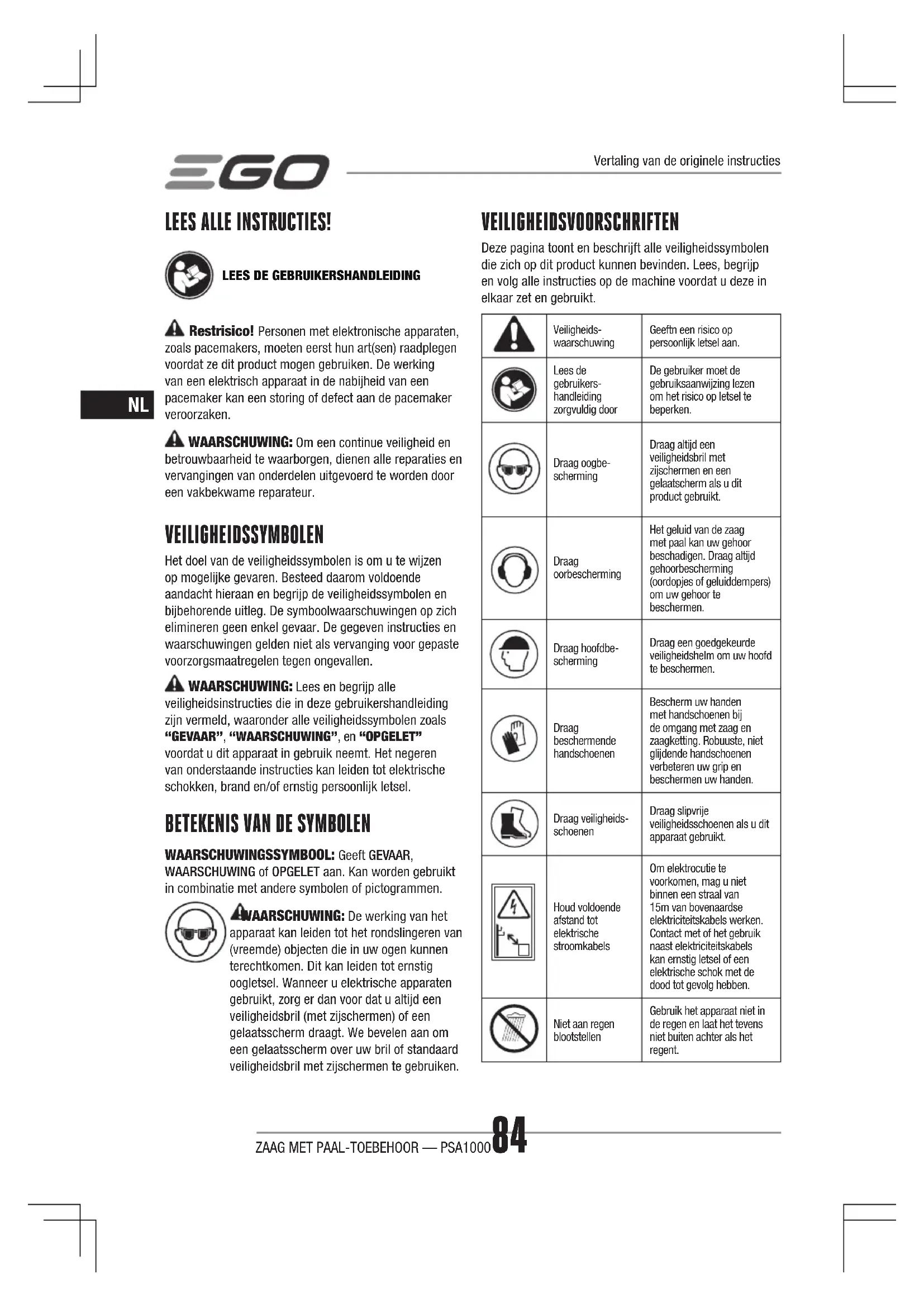 WAARSCHUWINGSSYMBOOL: Geeft GEVAAR, WAARSCHUWING of OPGELET aan. Kan worden gebruikt in combinatie met andere symbolen of pictogrammen. WAARSCHUWING: De werking van het apparaat kan leiden tot het rondslingeren van (vreemde) objecten die in uw ogen kunnen terechtkomen. Dit kan leiden tot ernstig oogletsel. Wanneer u elektrische apparaten gebruikt, zorg er dan voor dat u altijd een veiligheidsbril (met zijschermen) of een gelaatsscherm draagt. We bevelen aan om een gelaatsscherm over uw bril of standaard veiligheidsbril met zijschermen te gebruiken. VEILIGHEIDSVOORSCHRIFTEN Deze pagina toont en beschrijft alle veiligheidssymbolen die zich op dit product kunnen bevinden. Lees, begrijp en volg alle instructies op de machine voordat u deze in elkaar zet en gebruikt. Veiligheids-waarschuwingGeeftn een risico op persoonlijk letsel aan.Lees de gebruikers-handleiding zorgvuldig doorDe gebruiker moet de gebruiksaanwijzing lezen om het risico op letsel te beperken.Draag oogbe-schermingDraag altijd een veiligheidsbril met zijschermen en een gelaatscherm als u dit product gebruikt.Draag oorbeschermingHet geluid van de zaag met paal kan uw gehoor beschadigen. Draag altijd gehoorbescherming (oordopjes of geluiddempers) om uw gehoor te beschermen.Draag hoofdbe-schermingDraag een goedgekeurde veiligheidshelm om uw hoofd te beschermen.Draag beschermende handschoenenBescherm uw handen met handschoenen bij de omgang met zaag en zaagketting. Robuuste, niet glijdende handschoenen verbeteren uw grip en beschermen uw handen.Draag veiligheids-schoenenDraag slipvrije veiligheidsschoenen als u dit apparaat gebruikt.Houd voldoende afstand tot elektrische stroomkabelsOm elektrocutie te voorkomen, mag u niet binnen een straal van 15m van bovenaardse elektriciteitskabels werken. Contact met of het gebruik naast elektriciteitskabels kan ernstig letsel of een elektrische schok met de dood tot gevolg hebben.Niet aan regen blootstellenGebruik het apparaat niet in de regen en laat het tevens niet buiten achter als het regent. Vertaling van de originele instructiesZAAG MET PAAL-TOEBEHOOR — PSA1000 85