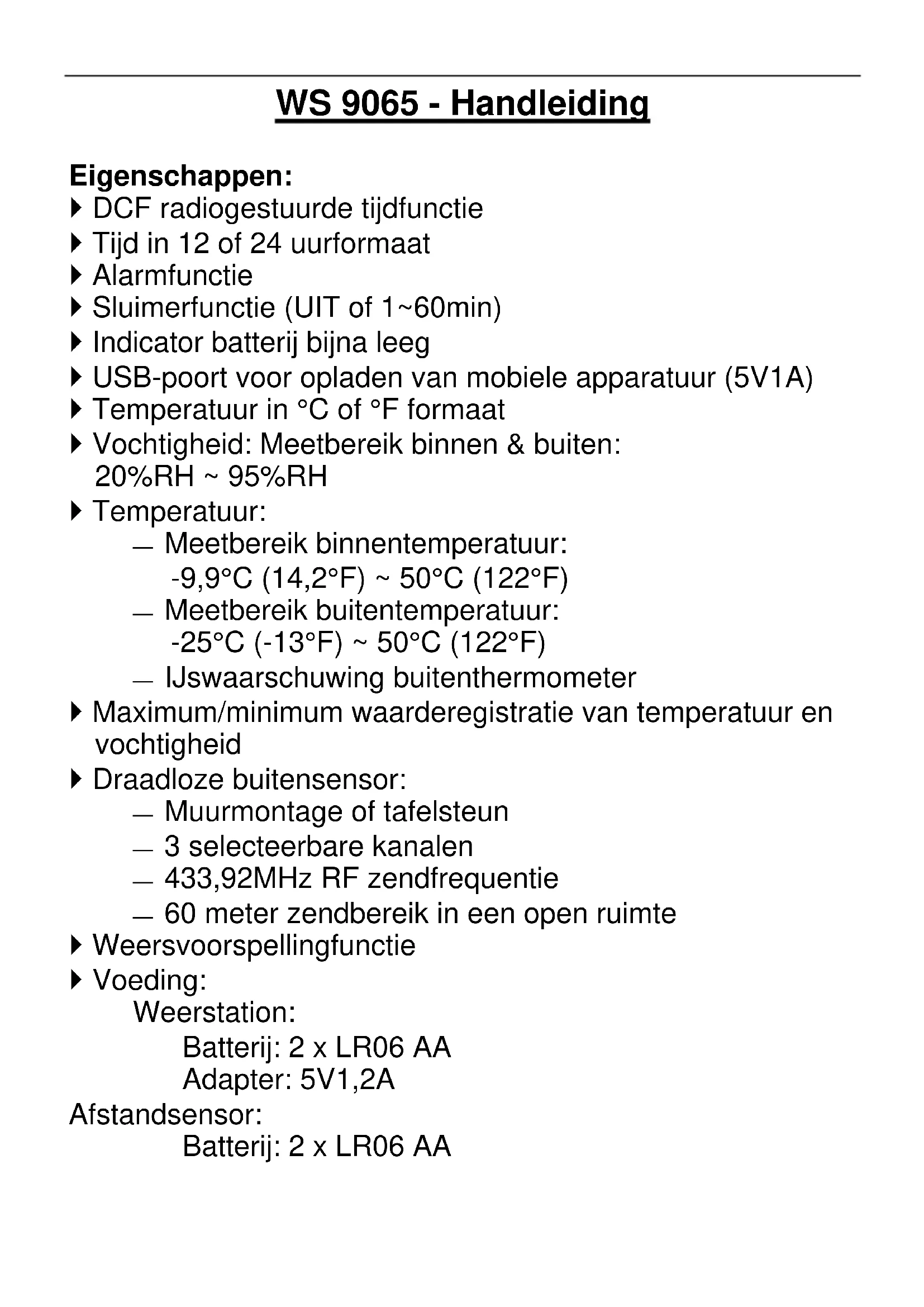 Función de predicción meteorológica La previsión meteorológica se calcula a partir de la evaluación de las fluctuaciones en la presión barométrica y puede desviarse de las condiciones meteorológicas actuales. La estación meteorológica muestra los siguientes símbolos meteorológicos: Soleado Ligeramente nuboso Nublado Lluvioso Nevando Aguaceros El símbolo meteorológico indica el tiempo meteorológico probable en las próximas 8 horas y no el tiempo actual. Retroiluminación En el modo batería alimentada, toque el botón “Light/snooze” y la retroiluminación se ilumina durante 8 segundos. Pulse el botón “rainbow” para fijar los diferentes colores de retroiluminación; cambia de color cada vez que se pulsa; existen 8 tipos: blanco, rojo, naranja, amarillo, verde, cian, azul y púrpura. En el modo adaptador alimentado, pulse el botón “-” para ajustar el brillo de la retroiluminación; pulse el botón “rainbow” para fijar los diferentes colores de retroiluminación. Pulse el botón “loop”; el color de la retroiluminación evolucionará lentamente; cuando evolucione a su color favorito, vuelva a pulsar el botón “loop” para mantenerse en ese color. Función de carga USB: La toma USB situada en la parte posterior de la unidad principal proporciona una potencia de salida CC de 5V 1A para la carga de dispositivos móviles manuales. Efectos ambientales en la recepción La estacion térmica obtiene la hora exacta con tecnología inalámbrica. Al igual que todos los dispositivos inalámbricos, las recepción puede verse afectada por las siguientes circunstancias: largas distancias de transmisión proximidad de montañas y valles proximidad de autopistas, vías de tren, aeropuertos, cables de alta tensión, etc. proximidad de edificios en construcción entre edificios altos en el interior de edificios de hormigón proximidad de aparatos eléctricos (PCs, TVs, etc.) y de estructuras metálicas en el interior de vehículos en movimiento Coloque la estación en una posición donde obtenga una señal óptima, p.ej. cerca de una ventana y lejos de superficies metálicas o aparatos eléctricos. Precauciones Esta unidad está diseñada para usarla solamente en interiores. No someta unidad a fuerzas o golpes excesivos. No exponga la unidad a temperaturas extremas, directa a los rayos del sol, polvo o humedad. No la sumerja en el agua. Evite el contacto con cualquier material corrosivo. No se deshaga de esta unidad arrojándola al fuego ya que puede explotar. No abra la carcasa trasera interior ni manipule ninguno de los componentes de esta unidad. Advertencias de seguridad sobre las baterías Utilizar solamente baterías alcalinas. No utilizar recargables baterías. Coloque las baterías correctamente haciendo coincidir la polaridad (+/-). Reemplace siempre el juego completo de baterías. Nunca mezcle baterías usadas y nuevas. Quite las baterías gastadas inmediatamente. Saque las baterías cuando no use la unidad. No recargue las baterías ni las arroje al fuego ya que pueden reventar. Compruebe que guarda las baterías alejadas de objetos metálicos ya que un contacto con estos puede causar un cortocircuito. Evite exponer las baterías a altas temperaturas, humedad o a los rayos directos del sol. Guarde las baterías lejos del alcance de los niños. Pueden atragantarse con ellas. Utilice el producto sólo para la finalidad expuesta! Obligación en virtud de la ley de baterías Las baterías usadas no deben ser eliminadas en la basura doméstica. Si las baterías llegan al medio ambiente, éstas pueden ocasionar graves efectos para la salud o para el proprio medio ambiente. Puede devolver las baterías usadas de forma gratuita a su distribuidor o suministrador. Según la ley, como consumidor uste destá obligado a devolver las baterías usadas! Obligación en virtud de la ley de los dispositivos eléctricos Este símbolo indica que no debe arrojar los dispositivos eléctricos a la basura doméstica general cuando alcancen el final de su vida a útil. Lleve su aparato a un punto de recogida selectiva de basura o a un centro de reciclaje. Esto es de aplicación en todos los países de la Unión Europea, y en otros países europeos con sistemas de recogida selectiva de basuras.WS 9065 - Handleiding Eigenschappen: DCF radiogestuurde tijdfunctie Tijd in 12 of 24 uurformaat Alarmfunctie Sluimerfunctie (UIT of 1~60min) Indicator batterij bijna leeg USB-poort voor opladen van mobiele apparatuur (5V1A) Temperatuur in °C of °F formaat Vochtigheid: Meetbereik binnen & buiten: 20%RH ~ 95%RH Temperatuur: — Meetbereik binnentemperatuur: -9,9°C (14,2°F) ~ 50°C (122°F) — Meetbereik buitentemperatuur: -25°C (-13°F) ~ 50°C (122°F) — IJswaarschuwing buitenthermometer Maximum/minimum waarderegistratie van temperatuur en vochtigheid Draadloze buitensensor: — Muurmontage of tafelsteun — 3 selecteerbare kanalen — 433,92MHz RF zendfrequentie — 60 meter zendbereik in een open ruimte Weersvoorspellingfunctie Voeding: Weerstation: Batterij: 2 x LR06 AA Adapter: 5V1,2A Afstandsensor: Batterij: 2 x LR06 AABeschrijving van uiterlijk: Station1: “Licht/sluimer”-tiptoets 2: “MODE”-toets 3: “MEM”-toets (geheugen) 4: “+” toets 5: “-/Golf”-toets 6: Aan-/uitschakelaar alarm 7: Adapteringang 8: USB-poort 9: “KANAAL”-toets 10: “lus”-toets 11: “regenboog”-toets 12: tijd 13: Indicator lage batterij in het weerstation 14: Temperatuur en vochtigheid binnenshuis 15: “Lage batterij”-sensor afstandsensor 16: Temperatuur en vochtigheid buiten 17: Symbooltje van weersvoorspelling 18: Weergave van barometrische druktendens 19: Icoontje van ijswaarschuwing 20: Icoontje tijd DST 21: “Radiogestuurd”-icoontje 22: Klepje van batterijhouder 23: Steun 24: Ophangoog voor muurmontageBeschrijving van uiterlijk: Buitensensor T1: Indicatielampje signaaloverdracht T2: Ophangoog voor muurmontage T3: Kanaalschakelaar T4: Klepje van batterijhouder T5: Toets voor heri