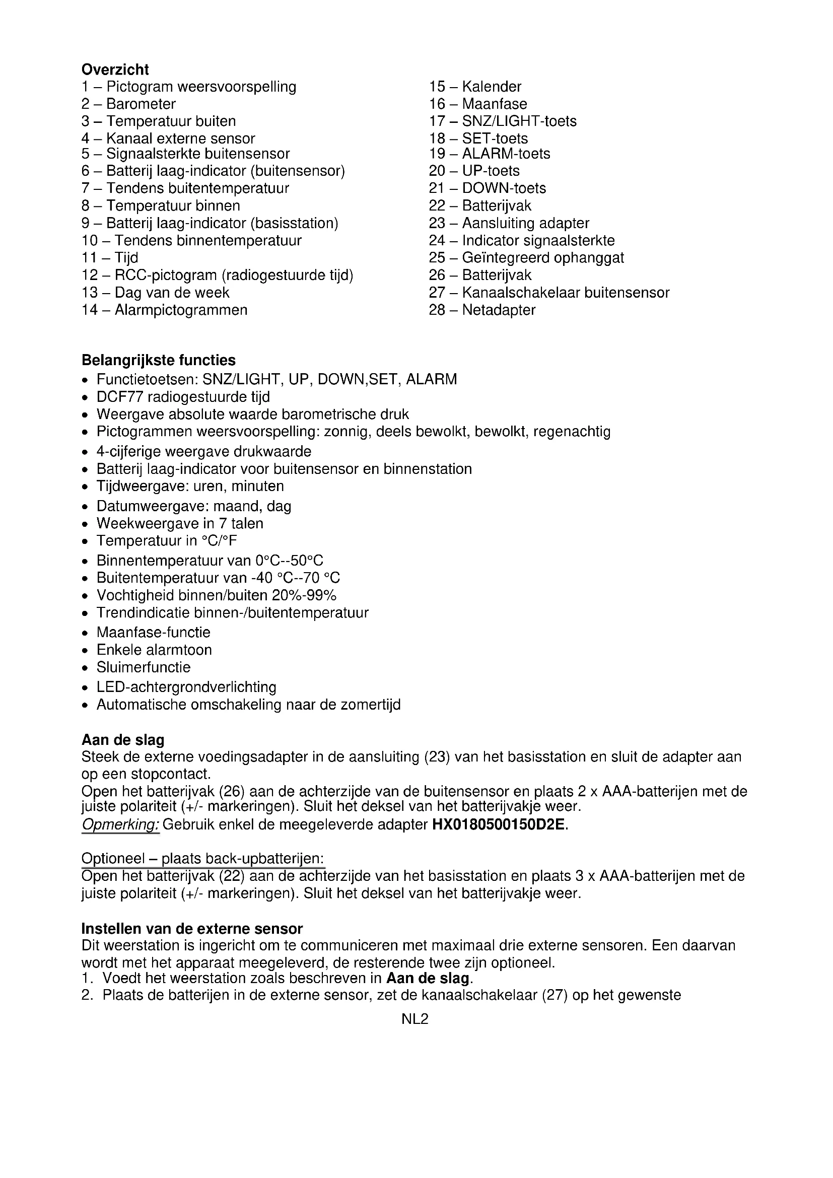 Belangrijkste functies Functietoetsen: SNZ/LIGHT, UP, DOWN,SET, ALARM DCF77 radiogestuurde tijd Weergave absolute waarde barometrische druk Pictogrammen weersvoorspelling: zonnig, deels bewolkt, bewolkt, regenachtig 4-cijferige weergave drukwaarde Batterij laag-indicator voor buitensensor en binnenstation Tijdweergave: uren, minuten Datumweergave: maand, dag Weekweergave in 7 talen Temperatuur in °C/°F Binnentemperatuur van 0°C--50°C Buitentemperatuur van -40 °C--70 °C Vochtigheid binnen/buiten 20%-99% Trendindicatie binnen-/buitentemperatuur Maanfase-functie Enkele alarmtoon Sluimerfunctie LED-achtergrondverlichting Automatische omschakeling naar de zomertijd Aan de slag Steek de externe voedingsadapter in de aansluiting (23) van het basisstation en sluit de adapter aan op een stopcontact. Open het batterijvak (26) aan de achterzijde van de buitensensor en plaats 2 x AAA-batterijen met de juiste polariteit (+/- markeringen). Sluit het deksel van het batterijvakje weer. Opmerking: Gebruik enkel de meegeleverde adapter HX0180500150D2E. Optioneel – plaats back-upbatterijen: Open het batterijvak (22) aan de achterzijde van het basisstation en plaats 3 x AAA-batterijen met de juiste polariteit (+/- markeringen). Sluit het deksel van het batterijvakje weer. Instellen van de externe sensor Dit weerstation is ingericht om te communiceren met maximaal drie externe sensoren. Een daarvan wordt met het apparaat meegeleverd, de resterende twee zijn optioneel.