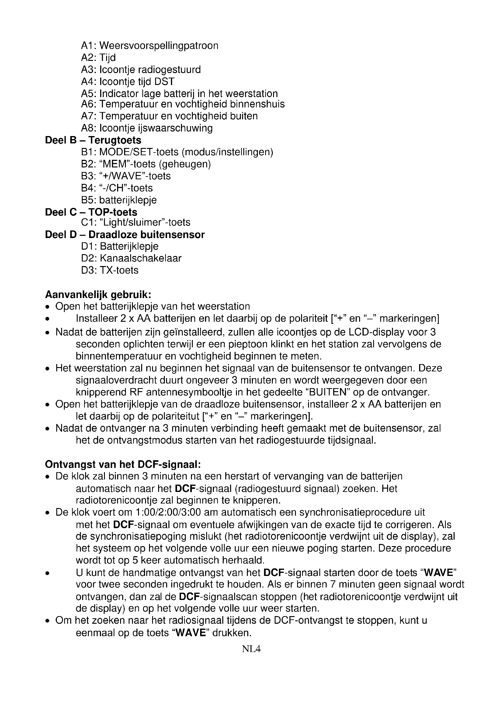Deel A – LCDNL4 A1: Weersvoorspellingpatroon A2: Tijd A3: Icoontje radiogestuurd A4: Icoontje tijd DST A5: Indicator lage batterij in het weerstation A6: Temperatuur en vochtigheid binnenshuis A7: Temperatuur en vochtigheid buiten A8: Icoontje ijswaarschuwing Deel B – Terugtoets B1: MODE/SET-toets (modus/instellingen) B2: “MEM”-toets (geheugen) B3: “+/WAVE”-toets B4: “-/CH”-toets B5: batterijklepje Deel C – TOP-toets C1: “Light/sluimer”-toets Deel D – Draadloze buitensensor D1: Batterijklepje D2: Kanaalschakelaar D3: TX-toets Aanvankelijk gebruik: Open het batterijklepje van het weerstation Installeer 2 x AA batterijen en let daarbij op de polariteit [“+” en “–” markeringen] Nadat de batterijen zijn geïnstalleerd, zullen alle icoontjes op de LCD-display voor 3 seconden oplichten terwijl er een pieptoon klinkt en het station zal vervolgens de binnentemperatuur en vochtigheid beginnen te meten. Het weerstation zal nu beginnen het signaal van de buitensensor te ontvangen. Deze signaaloverdracht duurt ongeveer 3 minuten en wordt weergegeven door een knipperend RF antennesymbooltje in het gedeelte “BUITEN” op de ontvanger. Open het batterijklepje van de draadloze buitensensor, installeer 2 x AA batterijen en let daarbij op de polariteitut [“+” en “–” markeringen]. Nadat de ontvanger na 3 minuten verbinding heeft gemaakt met de buitensensor, zal het de ontvangstmodus starten van het radiogestuurde tijdsignaal. Ontvangst van het DCF-signaal: De klok zal binnen 3 minuten na een herstart of vervanging van de batterijen automatisch naar het DCF-signaal (radiogestuurd signaal) zoeken. Het radiotorenicoontje zal beginnen te knipperen. De klok voert om 1:00/2:00/3:00 am automatisch een synchronisatieprocedure uit met het DCF-signaal om eventuele afwijkingen van de exacte tijd te corrigeren. Als de synchronisatiepoging mislukt (het radiotorenicoontje verdwijnt uit de display), zal het systeem op het volgende volle uur een nieuwe poging starten. Deze procedure wordt tot op 5 keer automatisch herhaald. U kunt de handmatige ontvangst van het DCF-signaal starten door de toets “WAVE” voor twee seconden ingedrukt te houden. Als er binnen 7 minuten geen signaal wordt ontvangen, dan zal de DCF-signaalscan stoppen (het radiotorenicoontje verdwijnt uit de display) en op het volgende volle uur weer starten. Om het zoeken naar het radiosignaal tijdens de DCF-ontvangst te stoppen, kunt u eenmaal op de toets “WAVE” drukken.NL5