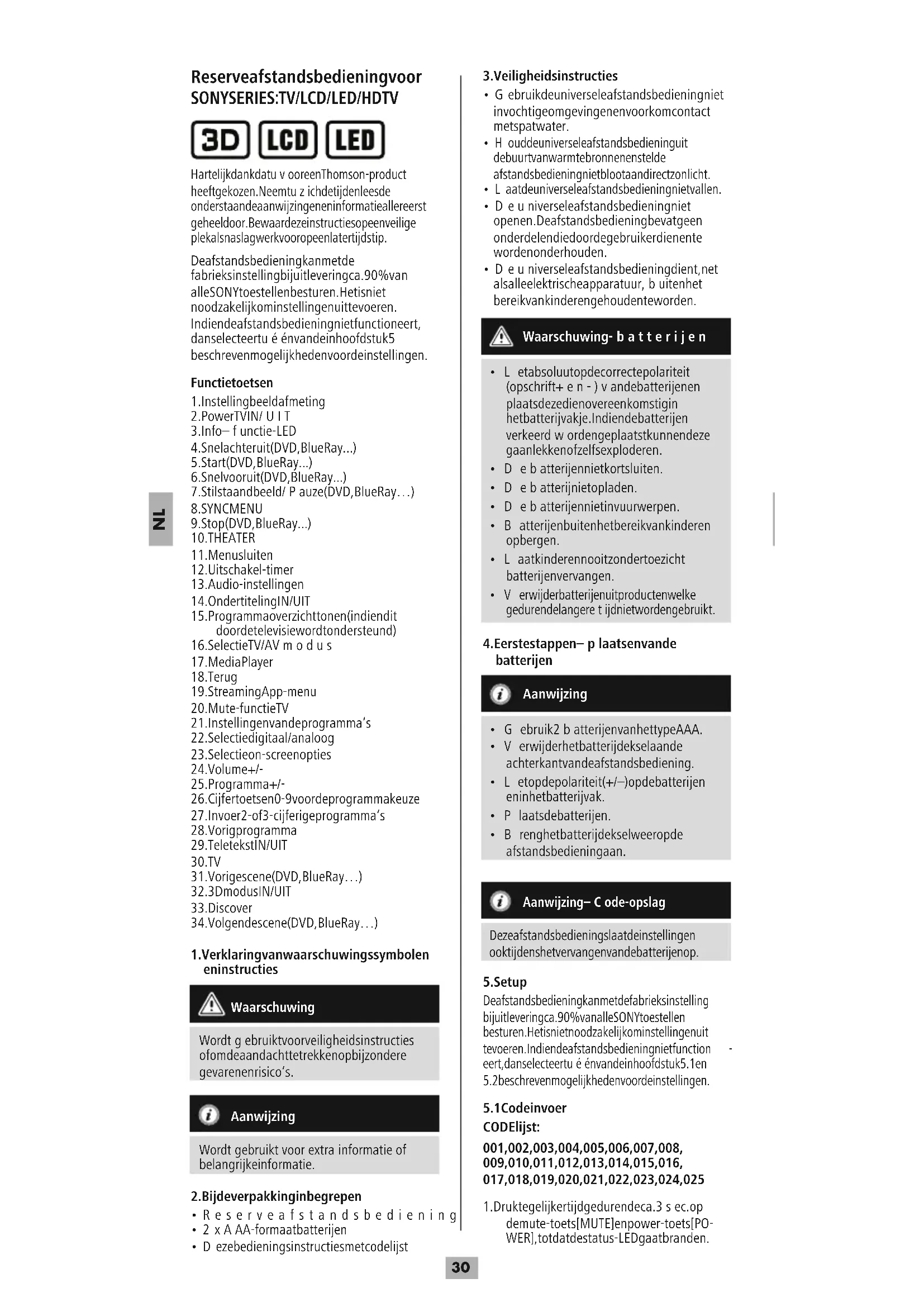 Hartelijk dank dat uvoor een Thomson-product heeft gekozen. Neemt uzich de tijd en lees de onderstaande aanwijzingen en informatie allereerst geheel door. Bewaar deze instructies op een veilige plek als naslagwerk voor op een later tijdstip. De afstandsbediening kan met de fabrieksinstelling bij uitlevering ca. 90% van alle SONY toestellen besturen. Het is niet noodzakelijk om instellingen uit te voeren. Indien de afstandsbediening niet functioneert, dan selecteert uéén van de in hoofdstuk 5 beschreven mogelijkheden voor de instellingen. Functietoetsen