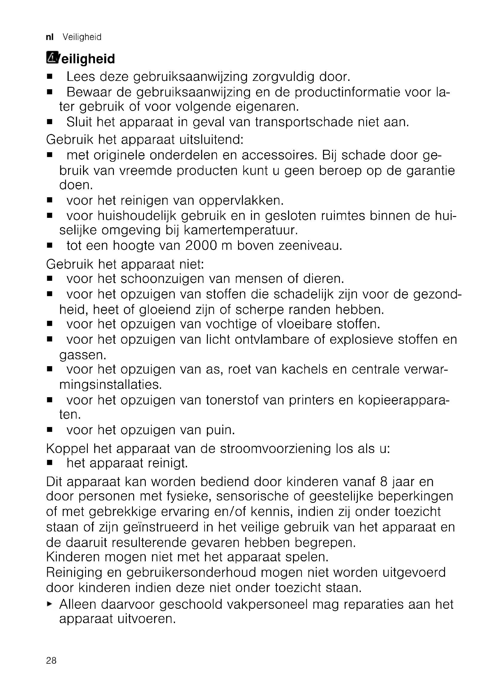 Rimuovere la causa dell'ostruzione. La spazzola della boc- chetta Turbo non ruota. Il rullo spazzola è sporco. Pulire il rullo spazzola. La potenza di aspirazione è insufficiente. Ruotare il regolatore alla massima potenza di aspirazione. Rottamazione di un apparecchio dismessoRottamazione di un apparec- chio dismesso Smaltire l'apparecchio nel rispetto dell'ambiente. Per informazioni sulle attuali procedure di smaltimento rivolgersi al rivenditore specializzato o al comune di competen- za. Questo apparecchio dispone di contrassegno ai sensi della direttiva europea 2012/19/UE in materia di apparecchi elet- trici ed elettronici (waste elec- trical and electronic equip- ment - WEEE). Questa direttiva definisce le norme per la raccolta e il rici- claggio degli apparecchi di- smessi valide su tutto il territo- rio dell’Unione Europea. 26Servizio di assistenza clienti it Servizio di assistenza clientiServizio di assistenza clienti Informazioni dettagliate sulla durata e sulle condizioni di garanzia in ciascun Paese so- no reperibili tramite il codice QR sul docu- mento allegato relativo ai contatti di assi- stenza e alle condizioni di garanzia, presso il nostro servizio di assistenza clienti, il vo- stro rivenditore o sul nostro sito web. I dati di contatto del servizio di assistenza clienti sono reperibili tramite il codice QR sul documento allegato relativo ai contatti di assistenza e alle condizioni di garanzia o sul nostro sito web. Le informazioni conformi alla normativa (EU) 2023/826 sono disponibili online alla voce www.bosch-home.com nella pagina del prodotto e nella pagina di assistenza dell'apparecchio nelle istruzioni per l'uso e nei documenti aggiuntivi. 27nl Veiligheid Veiligheid Veiligheid ¡ Lees deze gebruiksaanwijzing zorgvuldig door. ¡ Bewaar de gebruiksaanwijzing en de productinformatie voor la- ter gebruik of voor volgende eigenaren. ¡ Sluit het apparaat in geval van transportschade niet aan. Gebruik het apparaat uitsluitend: ¡ met originele onderdelen en accessoires. Bij schade door ge- bruik van vreemde producten kunt u geen beroep op de garantie doen. ¡ voor het reinigen van oppervlakken. ¡ voor huishoudelijk gebruik en in gesloten ruimtes binnen de hui- selijke omgeving bij kamertemperatuur. ¡ tot een hoogte van 2000m boven zeeniveau. Gebruik het apparaat niet: ¡ voor het schoonzuigen van mensen of dieren. ¡ voor het opzuigen van stoffen die schadelijk zijn voor de gezond- heid, heet of gloeiend zijn of scherpe randen hebben. ¡ voor het opzuigen van vochtige of vloeibare stoffen. ¡ voor het opzuigen van licht ontvlambare of explosieve stoffen en gassen. ¡ voor het opzuigen van as, roet van kachels en centrale verwar- mingsinstallaties. ¡ voor het opzuigen van tonerstof van printers en kopieerappara- ten. ¡ voor het opzuigen van puin. Koppel het apparaat van de stroomvoorziening los als u: ¡ het apparaat reinigt. Dit apparaat kan worden bediend door kinderen vanaf 8 jaar en door personen met fysieke, sensorische of geestelijke beperkingen of met gebrekkige ervaring en/of kennis, indien zij onder toezicht staan of zijn geïnstrueerd in het veilige gebruik van het apparaat en de daaruit resulterende gevaren hebben begrepen. Kinderen mogen niet met het apparaat spelen. Reiniging en gebruikersonderhoud mogen niet worden uitgevoerd door kinderen indien deze niet onder toezicht staan. Alleen daarvoor geschoold vakpersoneel mag reparaties aan het apparaat uitvoeren. 28Veiligheid nl Er mogen uitsluitend originele reserveonderdelen worden ge- bruikt voor reparatie van het apparaat. Als het netsnoer van dit apparaat beschadigd raakt, moet het ter vermijding van risico's worden vervangen door de fabrikant, de servicedienst of een andere gekwalificeerde persoon. Nooit een beschadigd apparaat gebruiken. Nooit een apparaat met gescheurd of gebroken oppervlak ge- bruiken. Nooit aan het netsnoer trekken, om het apparaat van het elektri- citeitsnet te scheiden. Altijd aan de stekker van het netsnoer trek- ken. Nooit het apparaat aan het netsnoer trekken of dragen. Wanneer het apparaat of het netsnoer is beschadigd, dan direct de stekker van het netsnoer uit het stopcontact halen of de zeke- ring in de meterkast uitschakelen. Contact opnemen met de servicedienst.
