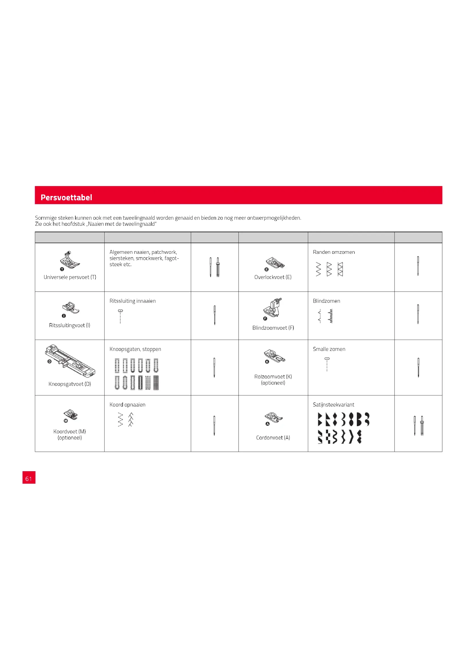 - De tweelingnaald hoort bij de speciale accessoire en wordt niet meegeleverd bij deze computergestuurde naaimachine. ❶ Tweelingnaald plaatsen. AANWIJZING: Bij gebruik van een tweelingnaald moet altijd de universele voet 🅣 gebruikt worden, ongeacht de naaimethode. Gebruik alleen tweelingnaalden met een max. tussenaf- stand van 2 mm. ❷ Gebruik de horizontale garenpen en volg de gebruike- lijke route voor het inrijgen. Linkernaald inrijgen. De tweede garenpen (meegeleverd met de acces- soires) bovenop in de betreffende opening steken. Tweede garenklos plaatsen. Zoals gebruikelijk inrijgen maar de draadgeleiding langs de naald laten lopen en de rechternaald inrijgen. ❸ Rijg elke naald apart in. AANWIJZING: Zorg ervoor dat de twee draden van de tweelingnaald van dezelfde dikte zijn. De kleuren kunnen natuurlijk variëren. ❹ Druk op de toets tweelingnaald en de maximale steekbreedte wordt automatisch verkleind voor het naaien met een tweelingnaald. ❺ Het display toont het symbool van de tweelingnaald en alle andere informatie. ❻ Kies een patroon en naai het. U kunt alle patronen behalve de directkeuzepatronen en de patronen 17–32 van de groep B en de patronen 08, 27 en 63 van de groep C gebruiken. Er worden twee parallelle rijen steken genaaid. AANWIJZING: Naai bij het naaien met een tweelingnaald altijd op een lage snelheid om mooie naairesultaten te bereiken.153