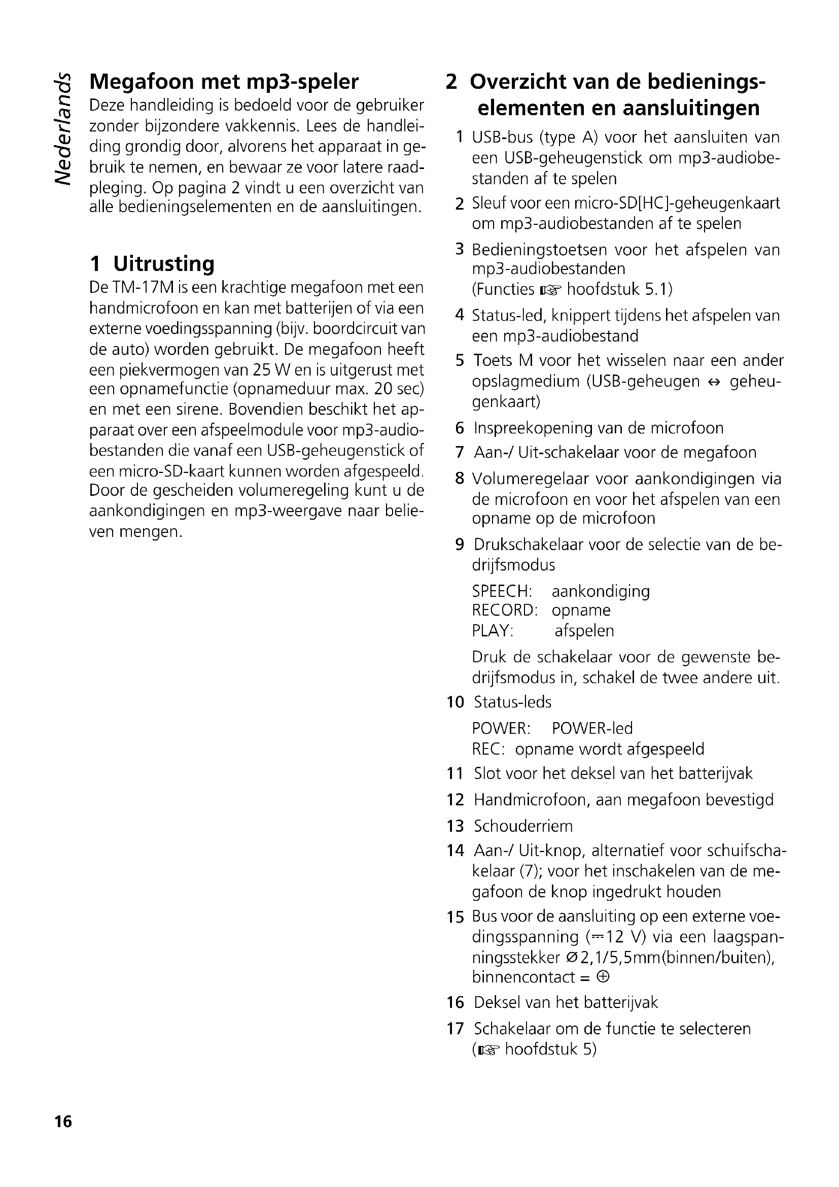 INTERNATIONAL GmbH & Co. KG si riserva ogni diritto di elaborazione in qualsiasi forma delle presenti istruzioni per l’uso. La riproduzione – anche parziale – per propri scopi commerciali è vietata.16 Referenz für Sprachkennzeichnung der Seiten und Inhaltsverzeichnis Referenz für Sprachen-Inhaltsverzeichnis Megafoon met mp3-speler Deze handleiding is bedoeld voor de gebruiker zonder bijzondere vakkennis. Lees de handlei- ding grondig door, alvorens het apparaat in ge- bruik te nemen, en bewaar ze voor latere raad- pleging. Op pagina 2 vindt u een overzicht van alle bedieningselementen en de aansluitingen. 1 Uitrusting De TM-17M is een krachtige megafoon met een handmicrofoon en kan met batterijen of via een externe voedingsspanning (bijv. boordcircuit van de auto) worden gebruikt. De megafoon heeft een piekvermogen van 25 W en is uitgerust met een opnamefunctie (opnameduur max. 20 sec) en met een sirene. Bovendien beschikt het ap- paraat over een afspeelmodule voor mp3-audio- bestanden die vanaf een USB-geheugenstick of een micro-SD-kaart kunnen worden afgespeeld. Door de gescheiden volumeregeling kunt u de aankondigingen en mp3-weergave naar belie- ven mengen. 2 Overzicht van de bedienings- elementen en aansluitingen