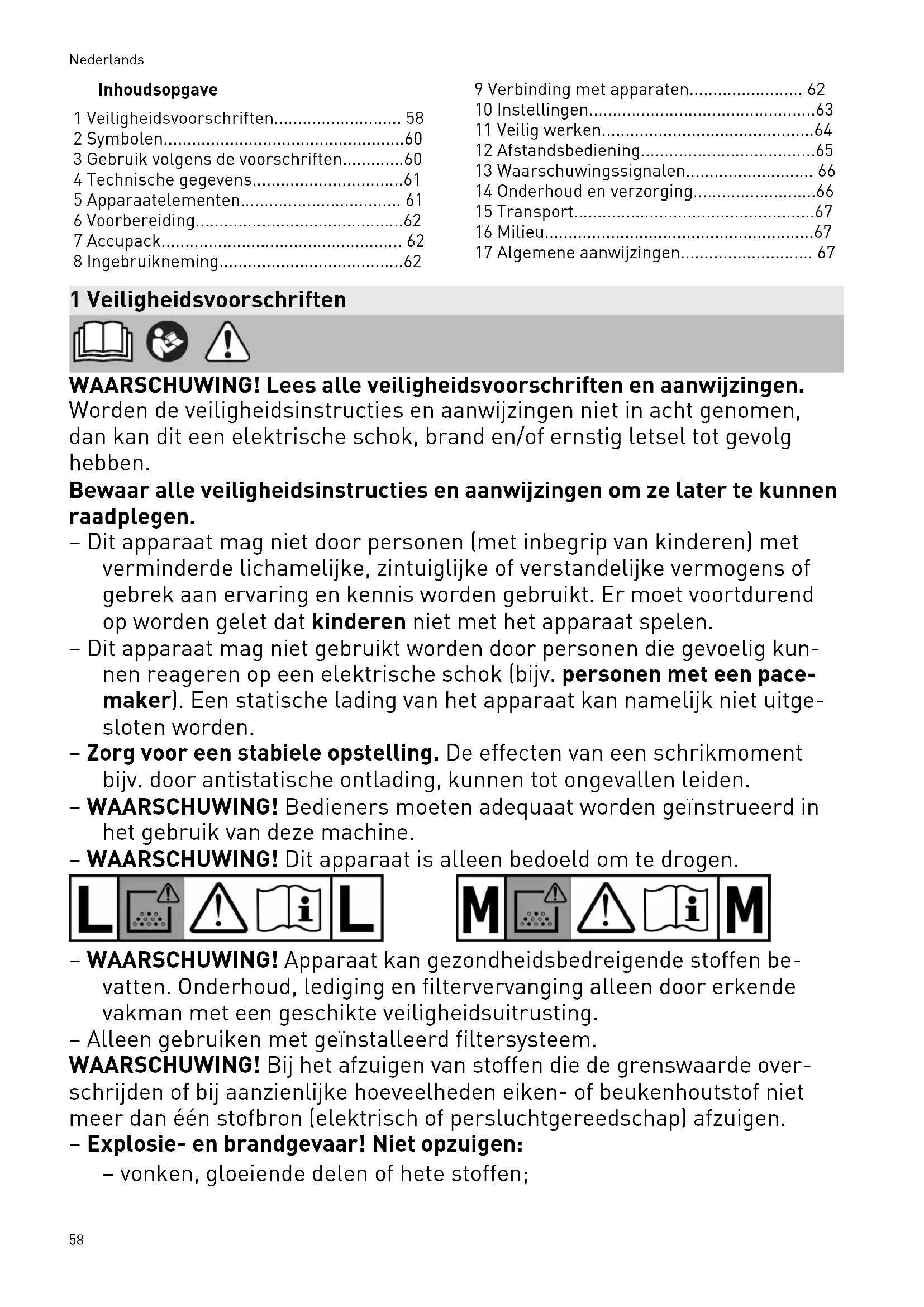 Waarschuwing! Het apparaat kan ge zondheidsbedreigende stoffen bevat ten! Verboden erop te klimmen Geen water of vloeistof opzuigen! Niet in de regen zetten! Kantelgevaar! Accupack inbrengen Accupack uitnemen Tip, aanwijzing Handelingsinstructie CE-markering: Bevestigt de conformi teit van het elektrische gereedschap met de richtlijnen van de Europese Unie. Niet met het huisvuil meegeven. Apparaat bevat een chip voor de opslag van gegevens. Zie hoofdstuk 17.2 3 Gebruik volgens de voorschriften