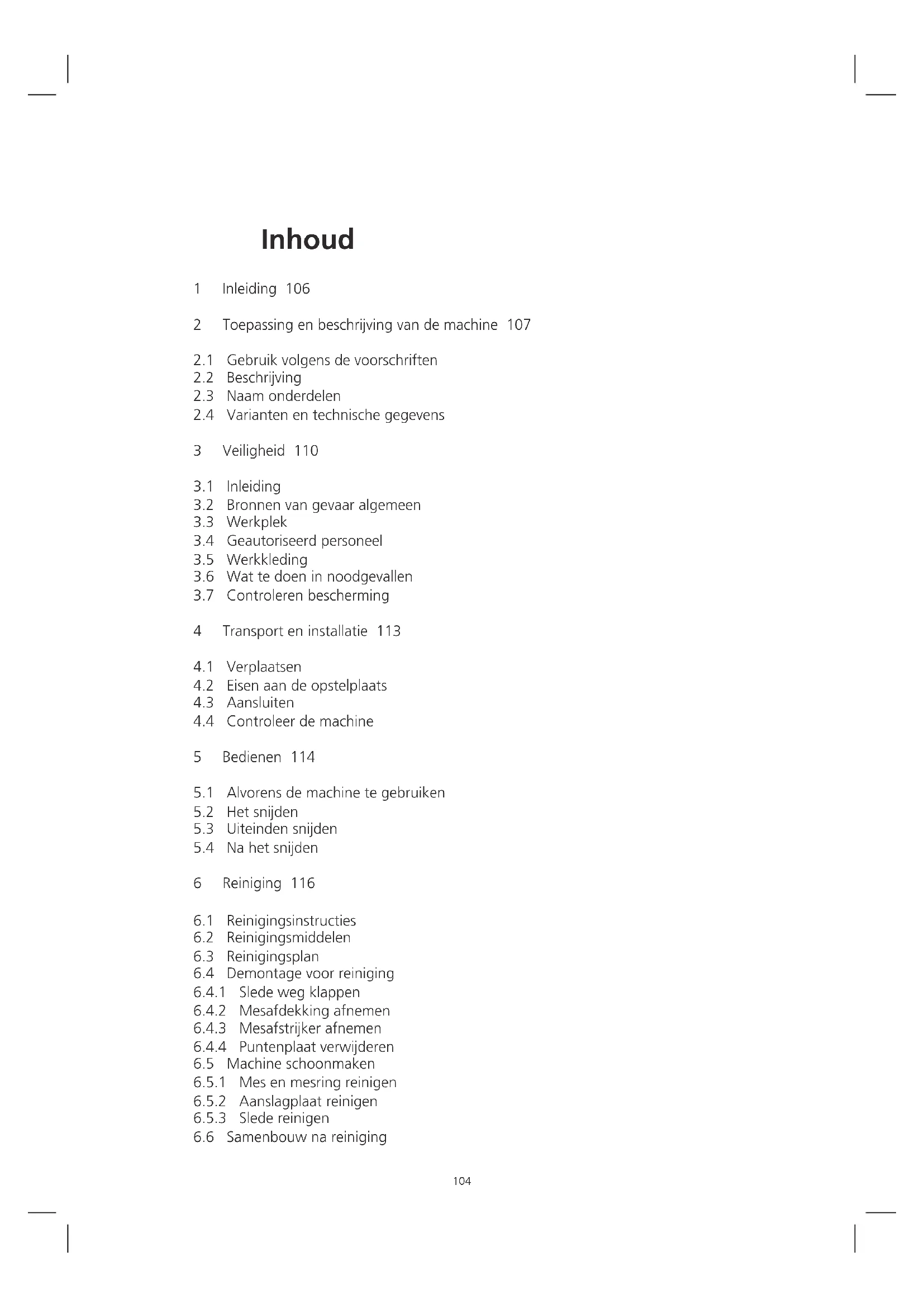 GEVAAR Aan een stilstaand en draaiend mes bestaat het gevaar door snden of afsnden. Als de machine niet in werking is, moet de aanslagplaat altd in nulpositie gesloten zn. GEVAAR De machine werkt met een netspanning van 230 V en mag vandaar niet worden geopend. Het beschermleidersysteem moet zeker aangesloten worden, omdat het anders tot zware stroomstoten kan komen. GEVAAR Opgelet - magnetische en elektromagnetische velden! Voordat personen met actieve implantaten (pacemaker etc.) in de buurt van de machine blven of deze bedienen, moet een individuële risicobeoordeling samen en ter plaatse door experten, de arbeidsgeneeskundige en eventueel een cardioloog worden uitgevoerd. WAARSCHUWING B het inklappen van de slede kan een hand gekneld raken. Houdt de niet gebruikte hand weg van de machine. VOORZICHTIG In de zone van de resthouder letselgevaar door de toppen en naar beneden vallen van de resthouder b het inleggen. VOORZICHTIG B het monteren van onderdelen, die voor de reiniging kunnen worden gedemon- teerd. 3 Veiligheid111