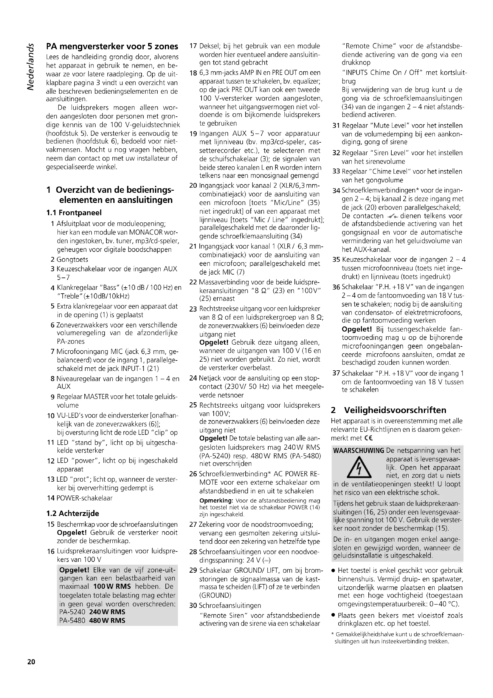 In geval van ongeoorloofd of verkeerd ge- bruik, verkeerde aansluiting resp. bediening of van herstelling door een niet-gekwalifi- ceerd persoon vervalt de garantie en de ver- antwoordelijkheid voor hieruit resulterende materiële of lichamelijke schade. Wanneer het apparaat definitief uit bedrijf wordt genomen, bezorg het dan voor milieuvriendelijke verwer- king aan een plaatselijk recyclage- bedrijf. 3 Toepassingen en toebehoren De versterkers PA-5240 en PA-5480 zijn speciaal voor het gebruik in PA-installaties van 100 V ontworpen. Ze beschikken over uitgangen van 100 V voor maximaal 5 PA- zones, waarvan u het volume individueel kunt instellen. Op de vijf met elkaar mengbare in- gangskanalen kunt u microfoons (kanalen 1 – 4) of apparatuur met lijnniveau (kanalen 2 – 5) aansluiten. In de extra opening (1) kunt u een van de volgende modules van MONACOR plaatsen: PA-1120DMT geheugen voor digitaleboodschappen met schakelklok PA-1140RCD radio / cd-speler PA-1200C schakelklok PA-1200RDS AM / FM-radio De PA-5000PTT van MONACOR, een PTT- tafelmicrofoon, is speciaal voor deze ver- sterkers als toebehoren ontworpen, en kan worden aangesloten via de schroefklemaan- sluitingen (34) van de kanalen 2 – 4. 4 De versterker opstellen De versterker is voorzien voor montage in een 19”-rack (482 mm), maar kan ook als tafelmodel gebruikt worden. In elk geval moet de lucht door alle ventilatieopeningen kunnen stromen, om voldoende ventilatie van de eindversterkers te verzekeren.