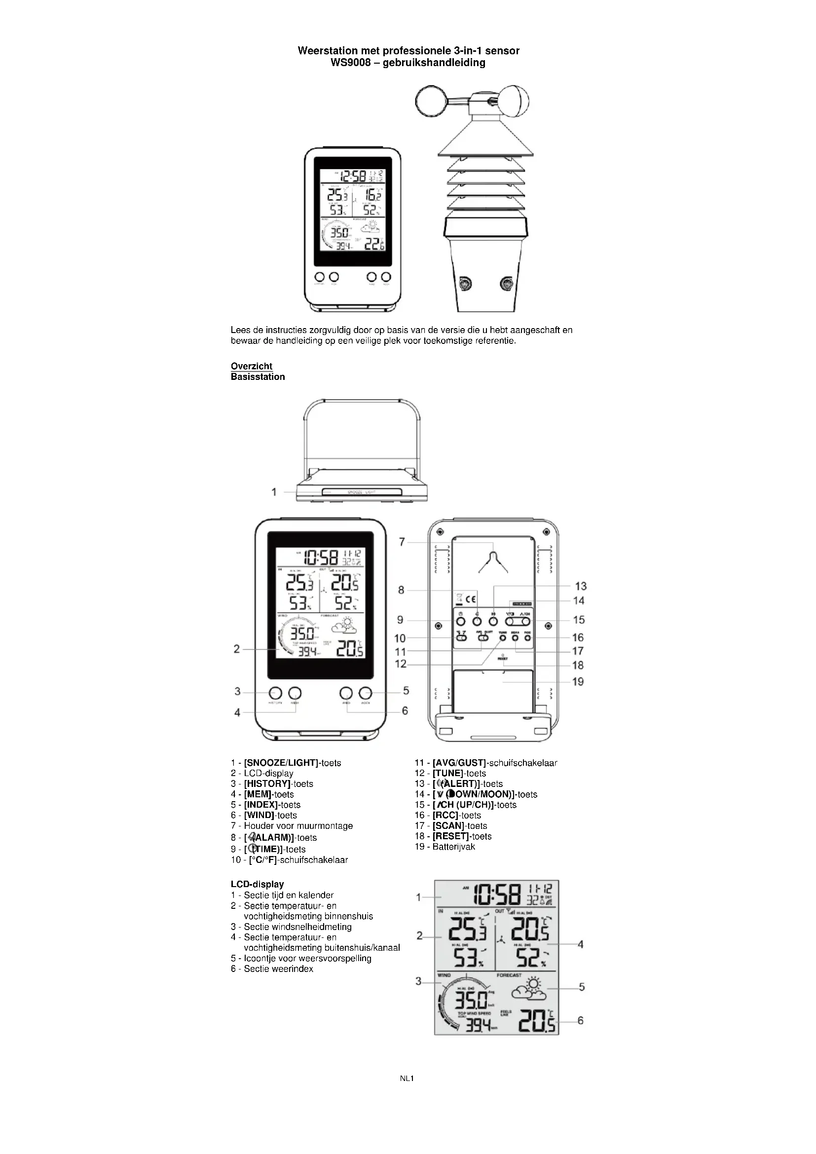 vooraan om de instellingen op te slaan en terug te keren naar de normale modus. De display zal ook terugkeren naar de normale modus als u 30 seconden lang op geen enkele toets drukt. Opmerking: De weerindex is gebaseerd op de gekalibreerde waarden voor de windsnelheid, temperatuur en vochtigheid. Het doel van de kalibratie is het fijner afstemmen of corrigeren van de fout van de sensor(en) geassocieerd met de foutmarge van de apparatuur. Fouten kunnen optreden wegens elektronische variatie (de temperatuursensor is bijvoorbeeld een resistief thermisch apparaat of RTD, de vochtigheidssensor is een capaciteitapparaat) of degradatie (verontreiniging van sensoren). De kalibratie is optioneel en alleen nuttig als u ter vergelijking een bekende gekalibreerde bron hebt. In dit gedeelte worden werkwijzen, procedures en bronnen voor sensorkalibratie besproken om fabricage- en degradatiefouten te verkleinen. Vergelijk uw meetresultaten niet met bronnen zoals internet, radio, televisie of kranten. Het doel van uw weerstation is het meten van de omstandigheden in uw omgeving en deze kunnen aanzienlijk verschillen van locatie tot locatie. Lage batterij indicator Wanneer de batterijindicator “ ” in de kloksectie verschijnt of als de LCD donkerder wordt, vervang dan onmiddellijk de batterijen door 2 nieuwe type AA batterijen. Als de “lage batterij”-indicator “ ” in de buitensectie verschijnt, dan betekent dit dat er onvoldoende batterijvermogen is voor de signaaloverdracht en u de batterijen onmiddellijk door 3 nieuwe type AA batterijen dient te vervangen. Technotrade verklaart hierbij dat dit product WS9008 voldoet aan de essentiële vereisten en andere relevante bepalingen van richtlijn 2014/53/EU en ROHS 2011/65/EC. De originele EU-conformiteitsverklaring is te vinden op: www.technoline.de/doc/4029665090085 Specificaties Station Afmetingen (B x H x D) 95 x 155 x 23 mm (afmeting zonder tafelsteun) Hoofdvoeding 2 x type AA 1,5V batterijen Temperatuurbereik -5°C tot 50°C (23°F tot 122°F) Weergavebereik van temperatuur (binnen/buiten) -40°C tot 70°C (-40°F tot 158°F) Weergavebereik van vochtigheid (binnen/buiten) RV 1% tot 99 % Weergavebereik windsnelheid 0 ~ 112mph, 50m/s, 180km/u, 97knopen Kalibratiemodus Knipperend icoontje van het geselecteerde kanaal Huidige afwijkwaarde Huidige verhogingswaardeNL9 Resolutie van temperatuur 1 decimaal (°C/°F) Resolutie van vochtigheid