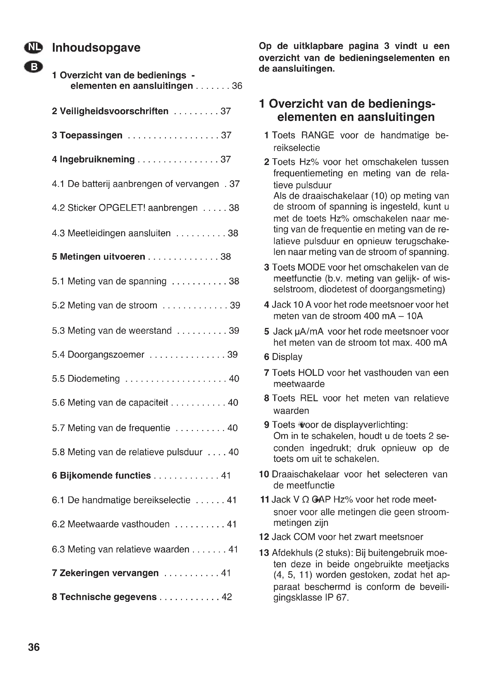 7 Zekeringen vervangen . . . . . . . . . . . 41 8 Technische gegevens . . . . . . . . . . . . 42 Op de uitklapbare pagina 3 vindt u een overzicht van de bedieningselementen en de aansluitingen. 1 Overzicht van de bedienings- elementen en aansluitingen 1 Toets RANGE voor de handmatige be- reikselectie 2 Toets Hz% voor het omschakelen tussen frequentiemeting en meting van de rela- tieve pulsduur Als de draaischakelaar (10) op meting van de stroom of spanning is ingesteld, kunt u met de toets Hz% omschakelen naar me- ting van de frequentie en meting van de re- latieve pulsduur en opnieuw terugschake- len naar meting van de stroom of spanning. 3 Toets MODE voor het omschakelen van de meetfunctie (b.v. meting van gelijk- of wis- selstroom, diodetest of doorgangsmeting) 4 Jack 10 A voor het rode meetsnoer voor het meten van de stroom 400 mA – 10A 5 Jack µA/mA voor het rode meetsnoer voor het meten van de stroom tot max. 400 mA 6 Display 7 Toets HOLD voor het vasthouden van een meetwaarde 8 Toets REL voor het meten van relatieve waarden 9 Toets voor de displayverlichting: Om in te schakelen, houdt u de toets 2 se- conden ingedrukt; druk opnieuw op de toets om uit te schakelen. 10 Draaischakelaar voor het selecteren van de meetfunctie 11 Jack V Ω CAP Hz% voor het rode meet- snoer voor alle metingen die geen stroom- metingen zijn 12 Jack COM voor het zwart meetsnoer 13 Afdekhuls (2 stuks): Bij buitengebruik moe- ten deze in beide ongebruikte meetjacks (4, 5, 11) worden gestoken, zodat het ap- paraat beschermd is conform de beveili- gingsklasse IP 67.
