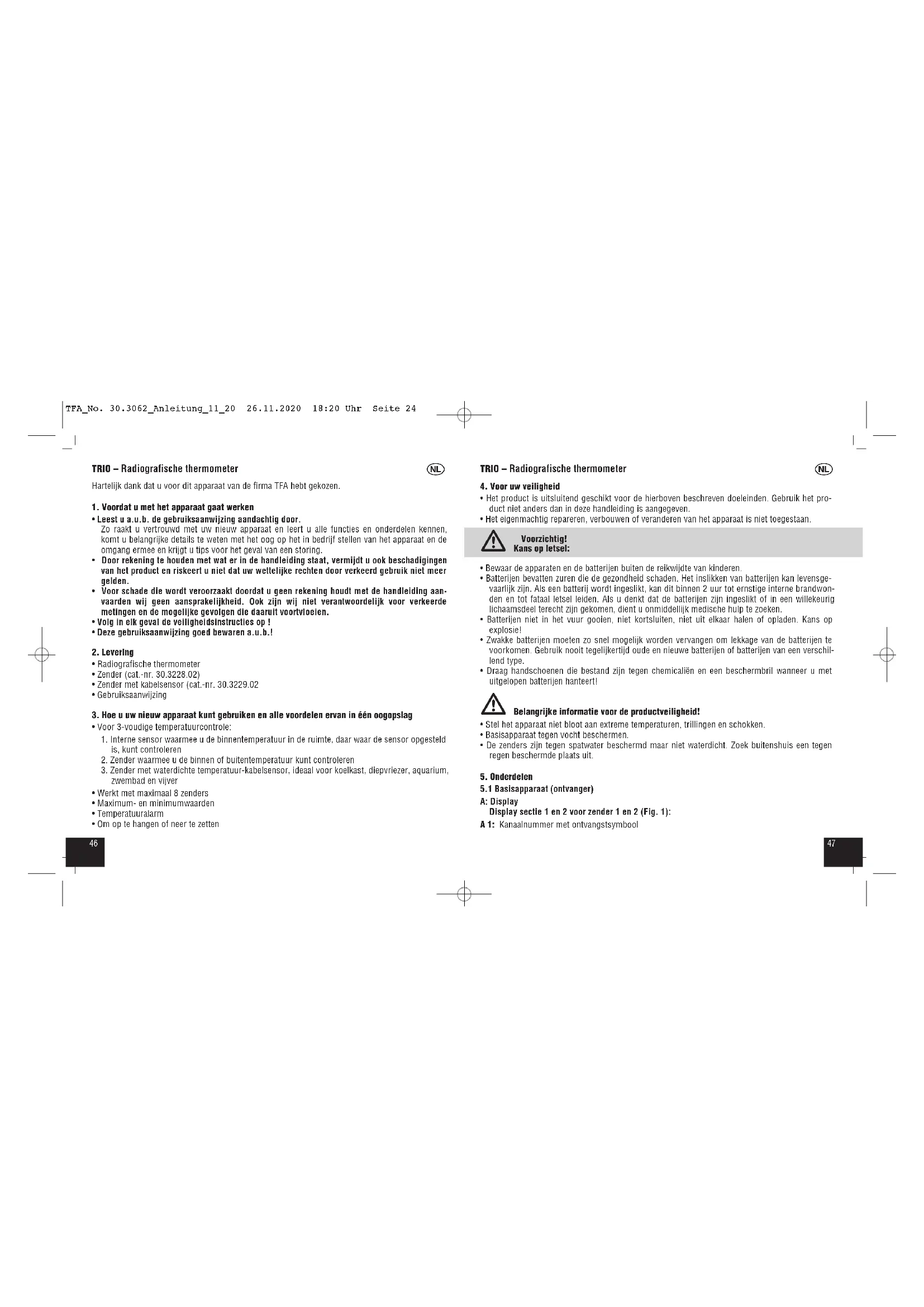 A: Display Display sectie 1 en 2 voor zender 1 en 2 (Fig. 1): A 1: Kanaalnummer met ontvangstsymbool TFA_No. 30.3062_Anleitung_11_20 26.11.2020 18:20 Uhr Seite 244948 TRIO – Radiografische thermometer