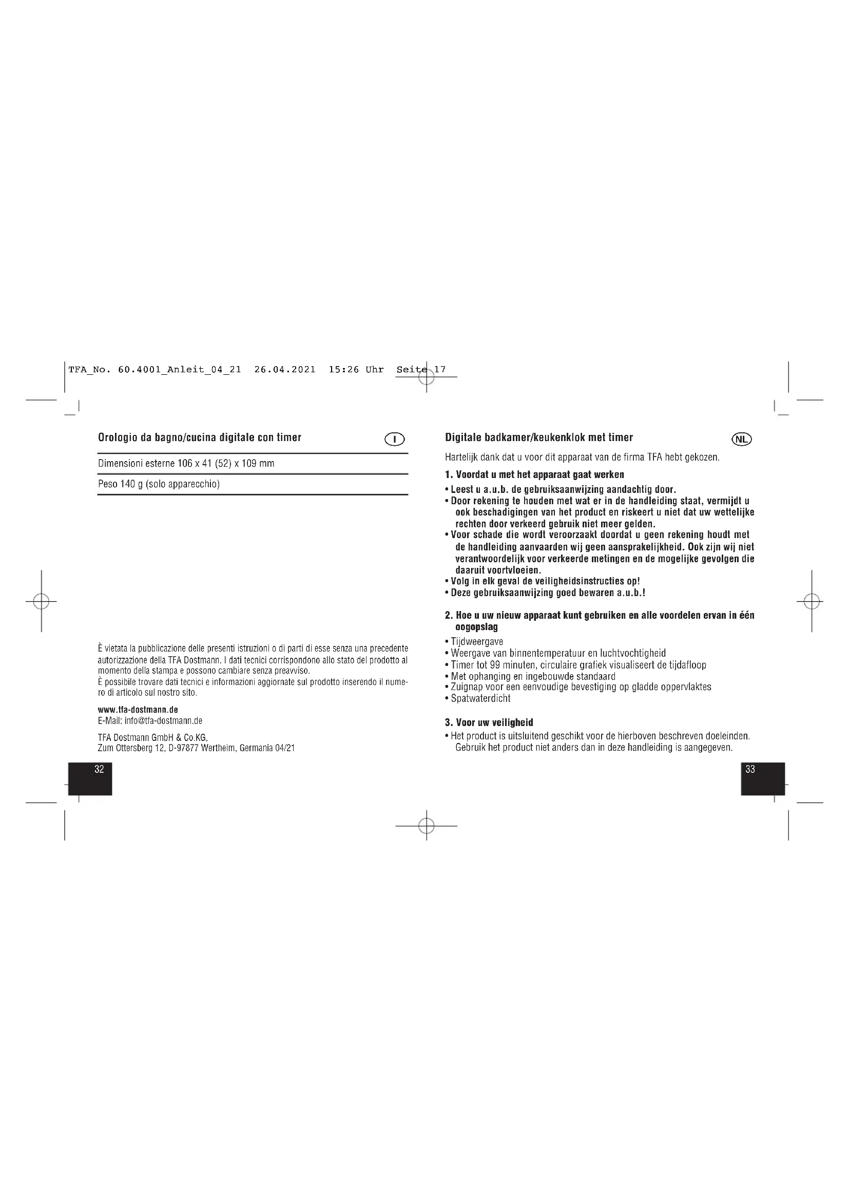 - Het product is uitsluitend geschikt voor de hierboven beschreven doeleinden. Gebruik het product niet anders dan in deze handleiding is aangegeven. TFA_No. 60.4001_Anleit_04_21 26.04.2021 15:26 Uhr Seite 173534 Digitale badkamer/keukenklok met timer