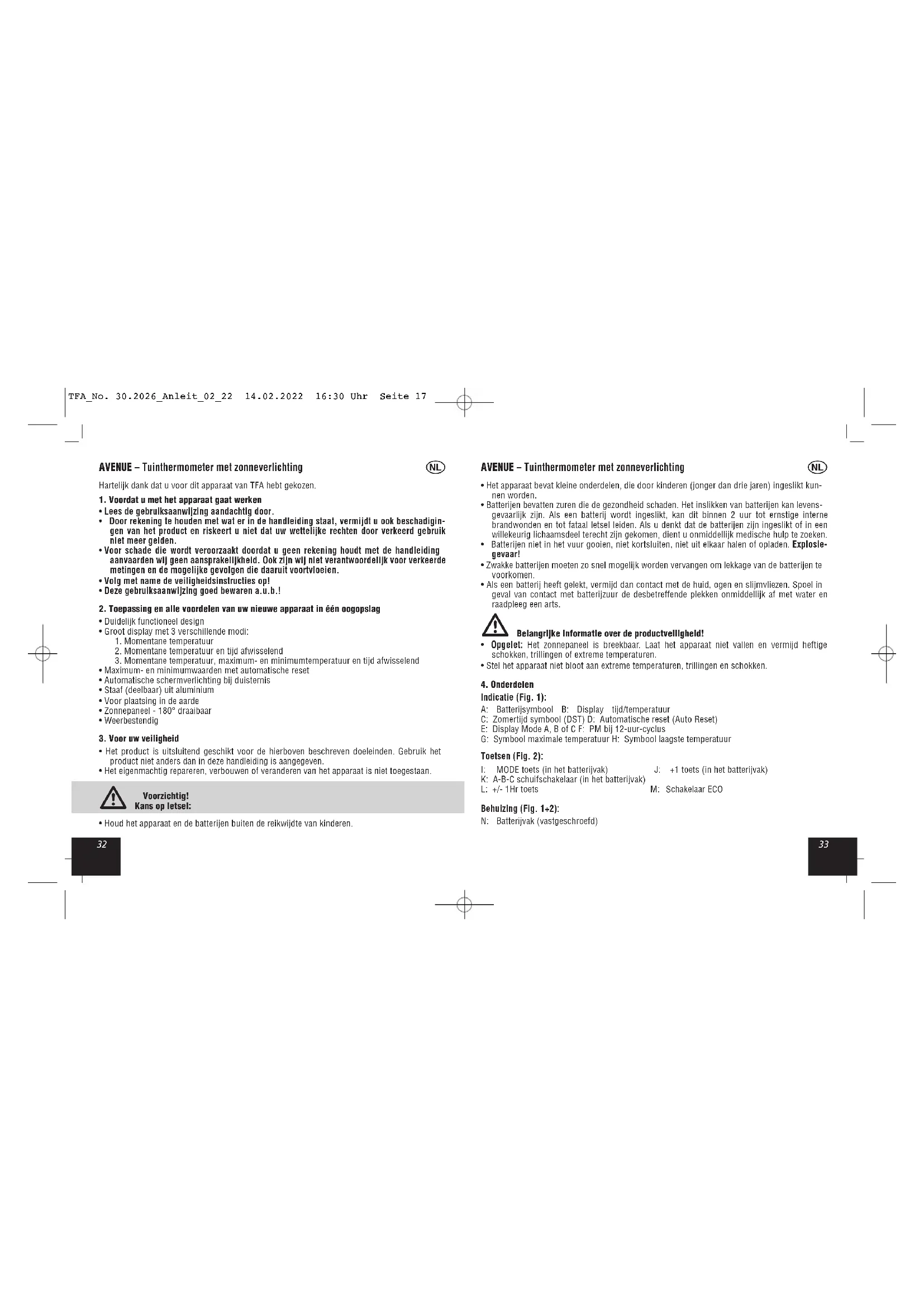 - Houd het apparaat en de batterijen buiten de reikwijdte van kinderen. TFA_No. 30.2026_Anleit_02_22 14.02.2022 16:30 Uhr Seite 17A VENUE – Tuinthermometer met zonneverlichting