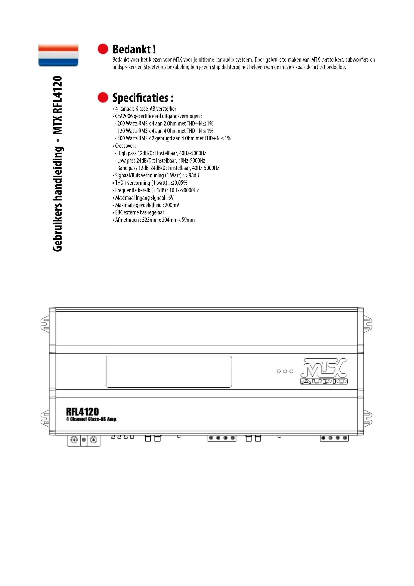 Gebruikers handleiding - MTX RFL4120 Bedankt ! Bedankt voor het kiezen voor MTX voor je ultieme car audio systeem. Door gebruik te maken van MTX versterkers, subwoofers en luidsprekers en Streetwires bekabeling ben je een stap dichterbij het beleven van de muziek zoals de artiest bedoelde. Specificaties :
