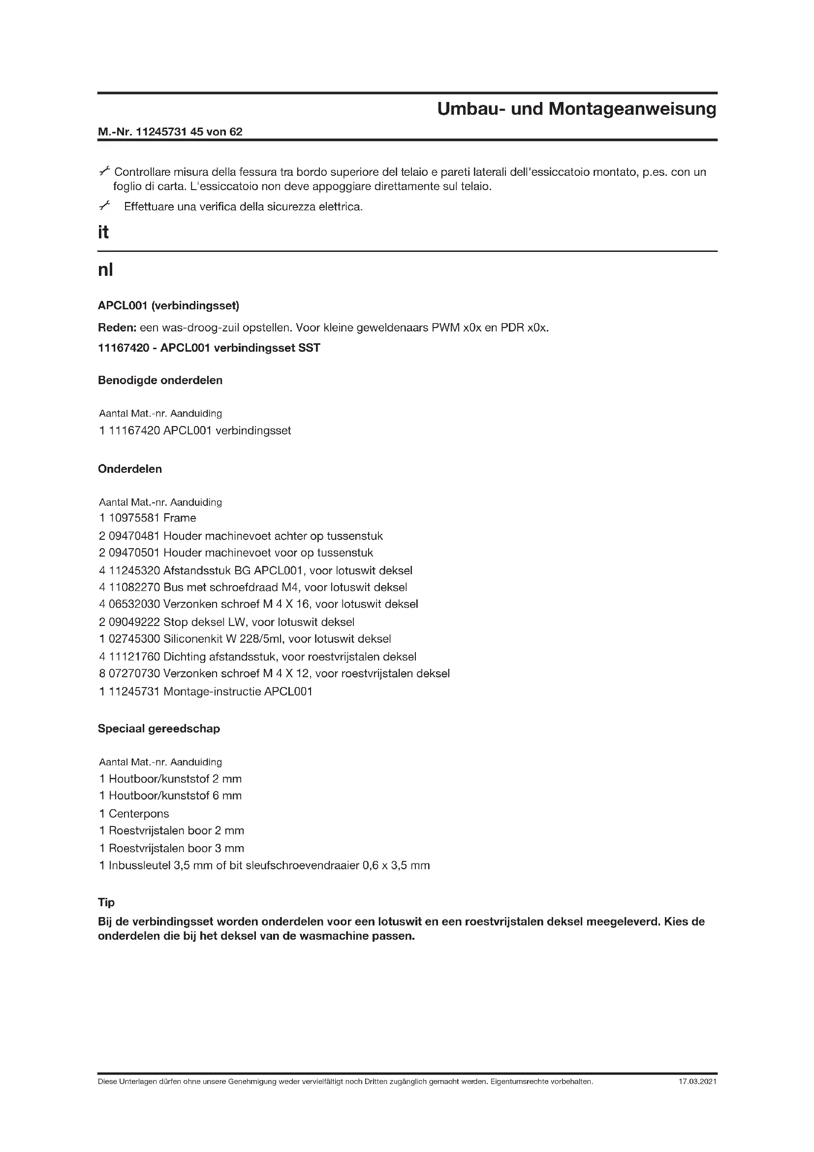 APCL001 (verbindingsset) Reden: een was-droog-zuil opstellen. Voor kleine geweldenaars PWM x0x en PDR x0x. 11167420 - APCL001 verbindingsset SST Benodigde onderdelen Aantal Mat.-nr. Aanduiding 1 11167420 APCL001 verbindingsset Onderdelen Aantal Mat.-nr. Aanduiding 1 10975581 Frame 2 09470481 Houder machinevoet achter op tussenstuk 2 09470501 Houder machinevoet voor op tussenstuk 4 11245320 Afstandsstuk BG APCL001, voor lotuswit deksel 4 11082270 Bus met schroefdraad M4, voor lotuswit deksel 4 06532030 Verzonken schroef M 4 X 16, voor lotuswit deksel 2 09049222 Stop deksel LW, voor lotuswit deksel 1 02745300 Siliconenkit W 228/5ml, voor lotuswit deksel 4 11121760 Dichting afstandsstuk, voor roestvrijstalen deksel 8 07270730 Verzonken schroef M 4 X 12, voor roestvrijstalen deksel 1 11245731 Montage-instructie APCL001 Speciaal gereedschap Aantal Mat.-nr. Aanduiding 1 Houtboor/kunststof 2 mm 1 Houtboor/kunststof 6 mm 1 Centerpons 1 Roestvrijstalen boor 2 mm 1 Roestvrijstalen boor 3 mm 1 Inbussleutel 3,5 mm of bit sleufschroevendraaier 0,6 x 3,5 mm Tip Bij de verbindingsset worden onderdelen voor een lotuswit en een roestvrijstalen deksel meegeleverd. Kies de onderdelen die bij het deksel van de wasmachine passen.Umbau- und Montageanweisung M.-Nr. 11245731 46 von 62 Diese Unterlagen dürfen ohne unsere Genehmigung weder vervielfältigt noch Dritten zugänglich gemacht werden. Eigentumsrechte vorbehalten. 17.03.2021 Risico door ondeskundig onderhoud WAARSCHUWING Risico door ondeskundig onderhoud. Ondeskundig onderhoud kan veel schade en ernstig letsel veroorzaken en levensgevaarlijk zijn. A Werkzaamheden mogen alleen door een vakman uitgevoerd worden A met inachtneming van alle geldende veiligheidsvoorschriften. A Lees eerst de Technische Service Documentatie (TSD) voordat u uw werkzaamheden begint. Gevaar voor verwondingen bij de montage GEVAAR Gevaar voor elektrische schok. Onderdelen kunnen onder spanning staan. A Voordat u onderhouds- en reparatiewerkzaamheden aan het apparaat uitvoert, dient u het apparaat spanningsvrij te maken. GEVAAR Gevaarlijk A Monteer de verbindingsset alleen op was- en droogautomaten, die niet geïnstalleerd zijn. Voor de de-installatie zie de gebruiksaanwijzing van het apparaat. A Zorg ervoor, dat tijdens de montagewerkzaamheden geen kinderen of dieren in de buurt kunnen komen. GEVAAR Gevaar voor beknelling A Draag stroeve handschoenen en veiligheidsschoenen. A Let erop, dat er geen lichaamsdelen, in het bijzonder handen en voeten, onder of tussen de apparaten komen. GEVAAR Pas op, vooral voor blessures aan de wervelkolom. De droger moet namelijk voor de montage op de wasmachine getild worden. A Let op het gewicht van de apparaten in verhouding tot de eigen fysieke kracht. Het gewicht van het apparaat wordt in de bijbehorende gebruiksaanwijzing vermeld. Verbindingsset APCL001 monteren Deksel lotuswit A Verwijder de beschermfolie van het frame. A Plaats het frame aan de achterkant zo, dat het naadloos op het deksel aansluit. Stel het frame af en markeer de 4 boorgaten (1), zie afb. 1. A Steek met een schroevendraaier aan de zijkant in de doppen van het deksel, zie afb. 2, (A).