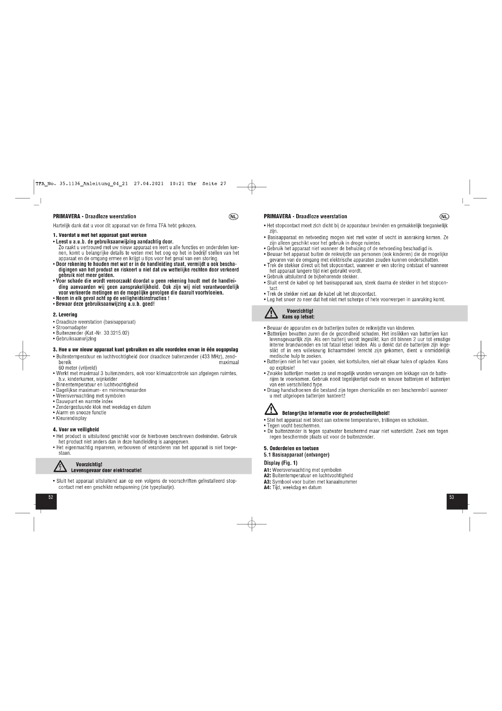 - Sluit het apparaat uitsluitend aan op een volgens de voorschriften geïnstalleerd stop- contact met een geschikte netspanning (zie typeplaatje). TFA_No. 35.1136_Anleitung_04_21 27.04.2021 10:21 Uhr Seite 275554 PRIMAVERA - Draadloze weerstation