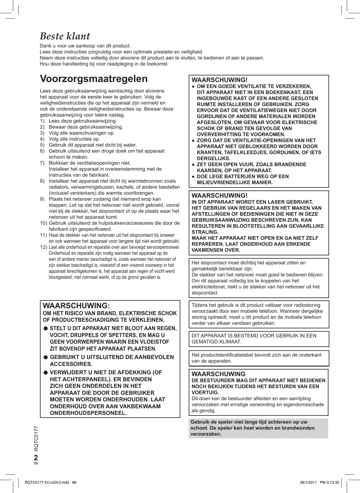 RQTC0177-D(¼òSw).indd 97 28/1/2011 AM 9:40:36 Beste klant Dank u voor uw aankoop van dit product. Lees deze instructies zorgvuldig voor een optimale prestatie en veiligheid. Neem deze instructies volledig door alvorens dit product aan te sluiten, te bedienen of aan te passen. Hou deze handleiding bij voor raadpleging in de toekomst. Voorzorgsmaatregelen Lees deze gebruiksaanwijzing aandachtig door alvorens het apparaat voor de eerste keer te gebruiken. Volg de veiligheidsinstructies die op het apparaat zijn vermeld en ook de onderstaande veiligheidsinstructies op. Bewaar deze gebruiksaanwijzing voor latere naslag.