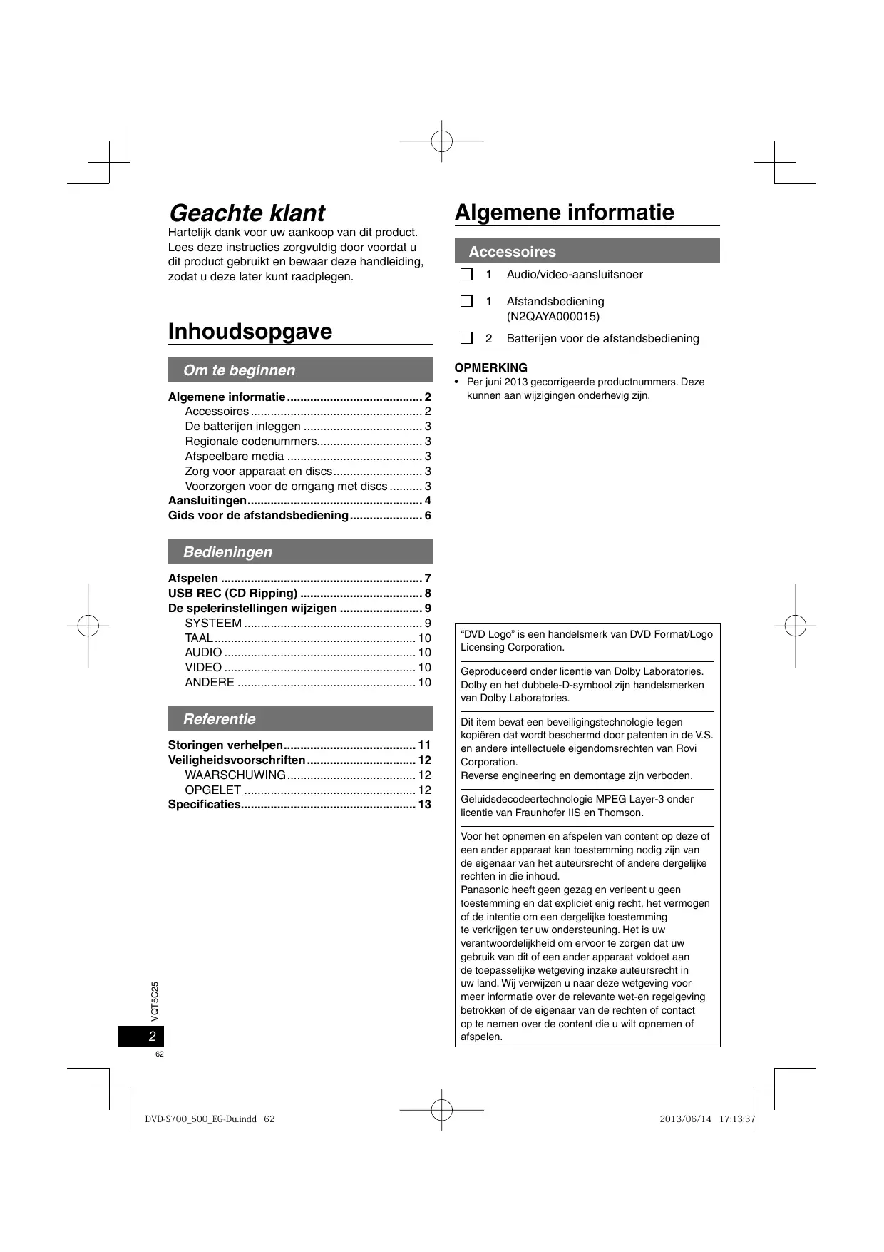 - DVD-S700̲500̲EG-Sw.indd 61 2013/06/14 17:02:18 Geachte klant Hartelijk dank voor uw aankoop van dit product. Lees deze instructies zorgvuldig door voordat u dit product gebruikt en bewaar deze handleiding, zodat u deze later kunt raadplegen. Inhoudsopgave Om te beginnen Algemene informatie p. 2