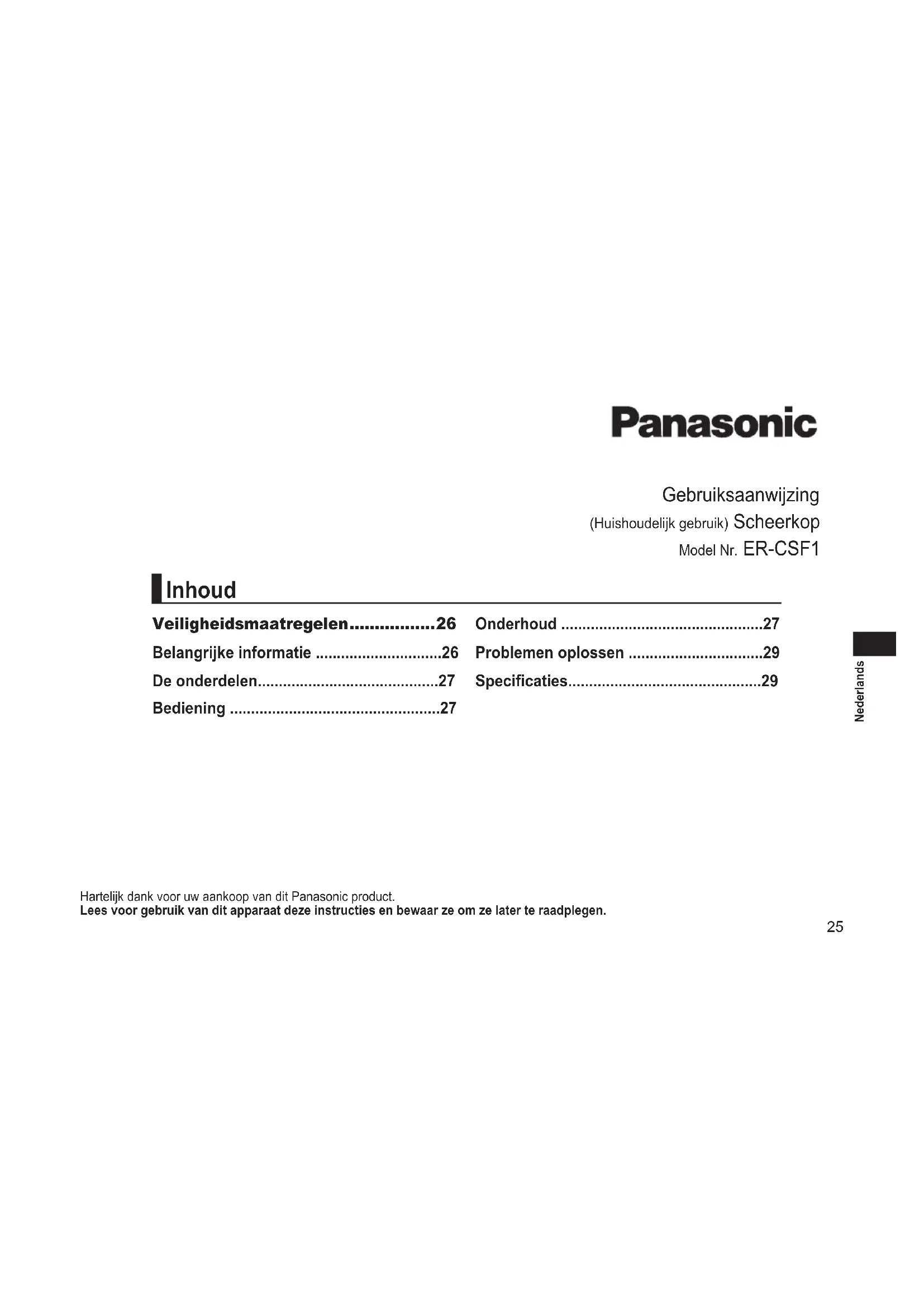 - Vervang het mesje. (Zie pagina 28.) Maakt veel lawaai. Reinig het mesje en breng smeerolie aan. (Zie pagina 27.) Controleer of het mesje correct is bevestigd. De geur wordt sterker. Dit kan worden verbeterd door elke keer na het scheren schoon te maken. Getrimde haren vliegen overal rond. Dit kan worden verbeterd door elke keer na het scheren schoon te maken. Reinig de messenblokken met de borstel wanneer er haartjes aan de messenblokken kleven. Het scheerbladensysteem wordt heet. Smeerolie aanbrengen. Vervang het scheerbladensysteem als dit beschadigd of vervormd is. (Zie pagina 28.) Als de problemen nog steeds niet zijn opgelost, neem contact op met uw dealer of met een door Panasonic erkend service center voor reparatie. Specicaties Door de lucht verspreid akoestisch geluid 62 (dB (A) re 1 pW) Dit product is uitsluitend bedoeld voor huishoudelijk gebruik.30 Español Instrucciones de funcionamiento (Usodoméstico) Cabezal de afeitadora Modelo n.º ER‑CSF1 Gracias por comprar este producto Panasonic. Antesdeponerestaunidadenfuncionamiento,lealasinstruccionesensutotalidadyguárdelasparasuusoenelfuturo. Precauciones de seguridad p. 31