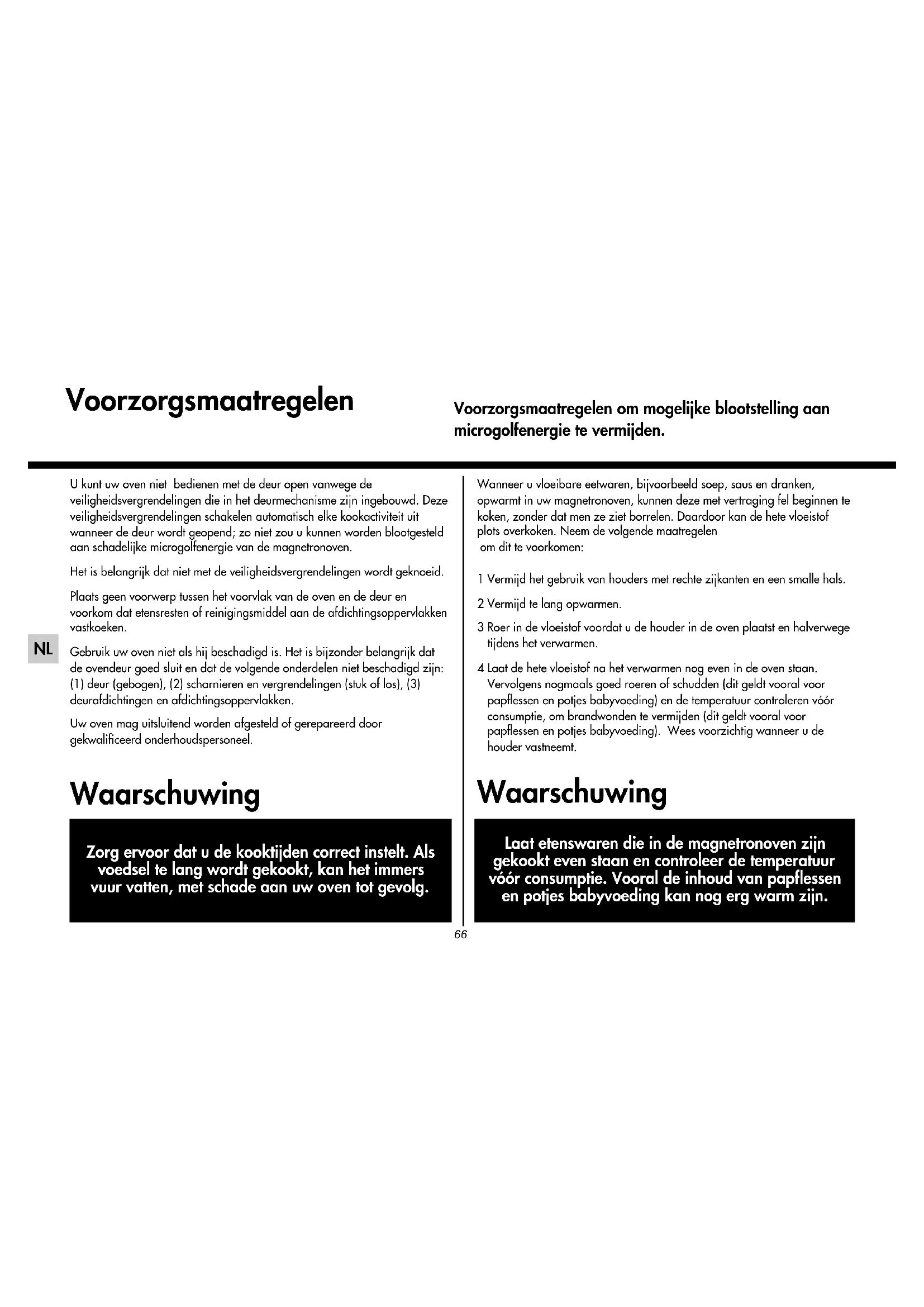 FRU kunt uw oven niet bedienen met de deur open vanwege de veiligheidsvergrendelingen die in het deurmechanisme zijn ingebouwd. Deze veiligheidsvergrendelingen schakelen automatisch elke kookactiviteit uit wanneer de deur wordt geopend; zo niet zou u kunnen worden blootgesteld aan schadelijke microgolfenergie van de magnetronoven. Het is belangrijk dat niet met de veiligheidsvergrendelingen wordt geknoeid. Plaats geen voorwerp tussen het voorvlak van de oven en de deur en voorkom dat etensresten of reinigingsmiddel aan de afdichtingsoppervlakken vastkoeken. Gebruik uw oven niet als hij beschadigd is. Het is bijzonder belangrijk dat de ovendeur goed sluit en dat de volgende onderdelen niet beschadigd zijn: (1) deur (gebogen), (2) scharnieren en vergrendelingen (stuk of los), (3) deurafdichtingen en afdichtingsoppervlakken. Uw oven mag uitsluitend worden afgesteld of gerepareerd door gekwalificeerd onderhoudspersoneel. Waarschuwing Voorzorgsmaatregelen om mogelijke blootstelling aan microgolfenergie te vermijden. Voorzorgsmaatregelen Wanneer u vloeibare eetwaren, bijvoorbeeld soep, saus en dranken, opwarmt in uw magnetronoven, kunnen deze met vertraging fel beginnen te koken, zonder dat men ze ziet borrelen. Daardoor kan de hete vloeistof plots overkoken. Neem de volgende maatregelen om dit te voorkomen: 1 Vermijd het gebruik van houders met rechte zijkanten en een smalle hals. 2 Vermijd te lang opwarmen. 3 Roer in de vloeistof voordat u de houder in de oven plaatst en halverwege tijdens het verwarmen. 4 Laat de hete vloeistof na het verwarmen nog even in de oven staan. Vervolgens nogmaals goed roeren of schudden (dit geldt vooral voor papflessen en potjes babyvoeding) en de temperatuur controleren vóór consumptie, om brandwonden te vermijden (dit geldt vooral voor papflessen en potjes babyvoeding). Wees voorzichtig wanneer u de houder vastneemt. Waarschuwing Laat etenswaren die in de magnetronoven zijn gekookt even staan en controleer de temperatuur vóór consumptie. Vooral de inhoud van papflessen en potjes babyvoeding kan nog erg warm zijn. Zorg ervoor dat u de kooktijden correct instelt. Als voedsel te lang wordt gekookt, kan het immers vuur vatten, met schade aan uw oven tot gevolg.