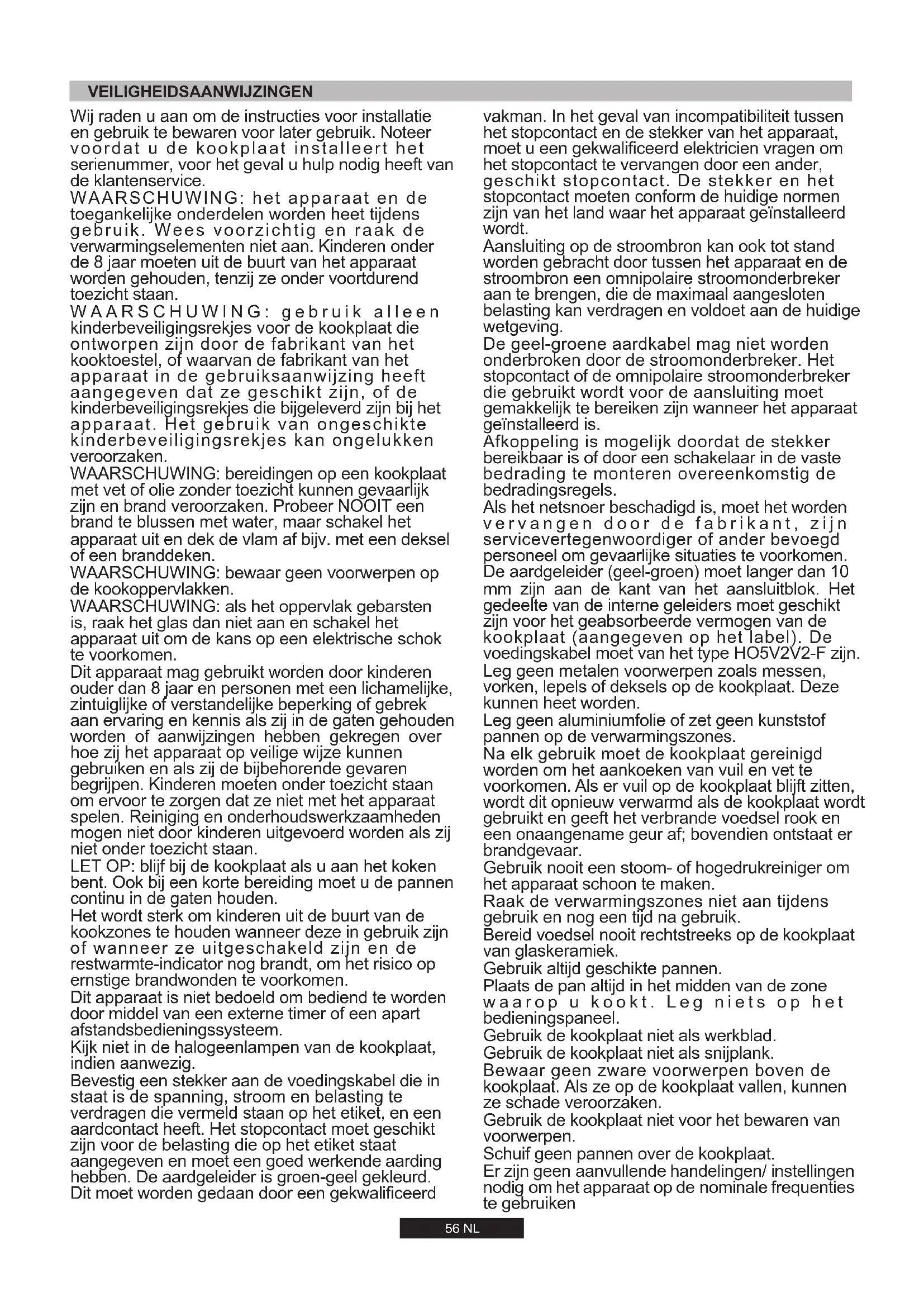 Plăcu]a arzătorului Arzător Tip FFD Aux 1kW Sr 1,75 kW R 2,7 kW Dc 4 kW Mono Puterea nominală a căldurii G20/20 mbar G30/28-30 mbar Clasa de instalare Voltaj / Frecvenţă V / Hz Putere intrare Aprindere electrică Dimensiuni produs UR 3,5 kW56 NL LET OP: blijf bij de kookplaat als u aan het koken bent. Ook bij een korte bereiding moet u de pannen continu in de gaten houden. Bevestig een stekker aan de voedingskabel die in staat is de spanning, stroom en belasting te verdragen die vermeld staan op het etiket, en een aardcontact heeft. Het stopcontact moet geschikt zijn voor de belasting die op het etiket staat aangegeven en moet een goed werkende aarding hebben. De aardgeleider is groen-geel gekleurd. Dit moet worden gedaan door een gekwalificeerd WAARSCHUWING: het apparaat en de toegankelijke onderdelen worden heet tijdens gebruik. Wees voorzichtig en raak de verwarmingselementen niet aan. Kinderen onder de 8 jaar moeten uit de buurt van het apparaat worden gehouden, tenzij ze onder voortdurend toezicht staan. WAARSCHUWING: bereidingen op een kookplaat met vet of olie zonder toezicht kunnen gevaarlijk zijn en brand veroorzaken. Probeer NOOIT een brand te blussen met water, maar schakel het apparaat uit en dek de vlam af bijv. met een deksel of een branddeken. WAARSCHUWING: gebruik alleen kinderbeveiligingsrekjes voor de kookplaat die ontworpen zijn door de fabrikant van het kooktoestel, of waarvan de fabrikant van het apparaat in de gebruiksaanwijzing heeft aangegeven dat ze geschikt zijn, of de kinderbeveiligingsrekjes die bijgeleverd zijn bij het apparaat. Het gebruik van ongeschikte kinderbeveiligingsrekjes kan ongelukken veroorzaken. WAARSCHUWING: bewaar geen voorwerpen op de kookoppervlakken. Het wordt sterk om kinderen uit de buurt van de kookzones te houden wanneer deze in gebruik zijn of wanneer ze uitgeschakeld zijn en de restwarmte-indicator nog brandt, om het risico op ernstige brandwonden te voorkomen. Wij raden u aan om de instructies voor installatie en gebruik te bewaren voor later gebruik. Noteer voordat u de kookplaat installeert het serienummer, voor het geval u hulp nodig heeft van de klantenservice. Dit apparaat is niet bedoeld om bediend te worden door middel van een externe timer of een apart afstandsbedieningssysteem. Kijk niet in de halogeenlampen van de kookplaat, indien aanwezig. WAARSCHUWING: als het oppervlak gebarsten is, raak het glas dan niet aan en schakel het apparaat uit om de kans op een elektrische schok te voorkomen. Dit apparaat mag gebruikt worden door kinderen ouder dan 8 jaar en personen met een lichamelijke, zintuiglijke of verstandelijke beperking of gebrek aan ervaring en kennis als zij in de gaten gehouden worden of aanwijzingen hebben gekregen over hoe zij het apparaat op veilige wijze kunnen gebruiken en als zij de bijbehorende gevaren begrijpen. Kinderen moeten onder toezicht staan om ervoor te zorgen dat ze niet met het apparaat spelen. Reiniging en onderhoudswerkzaamheden mogen niet door kinderen uitgevoerd worden als zij niet onder toezicht staan. VEILIGHEIDSAANWIJZINGEN Plaats de pan altijd in het midden van de zone waarop u kookt. Leg niets op het bedieningspaneel. Aansluiting op de stroombron kan ook tot stand worden gebracht door tussen het apparaat en de stroombron een omnipolaire stroomonderbreker aan te brengen, die de maximaal aangesloten belasting kan verdragen en voldoet aan de huidige wetgeving. vakman. In het geval van incompatibiliteit tussen het stopcontact en de stekker van het apparaat, moet u een gekwalificeerd elektricien vragen om het stopcontact te vervangen door een ander, geschikt stopcontact. De stekker en het stopcontact moeten conform de huidige normen zijn van het land waar het apparaat geïnstalleerd wordt. De geel-groene aardkabel mag niet worden onderbroken door de stroomonderbreker. Het stopcontact of de omnipolaire stroomonderbreker die gebruikt wordt voor de aansluiting moet gemakkelijk te bereiken zijn wanneer het apparaat geïnstalleerd is. Leg geen metalen voorwerpen zoals messen, vorken, lepels of deksels op de kookplaat. Deze kunnen heet worden. Na elk gebruik moet de kookplaat gereinigd worden om het aankoeken van vuil en vet te voorkomen. Als er vuil op de kookplaat blijft zitten, wordt dit opnieuw verwarmd als de kookplaat wordt gebruikt en geeft het verbrande voedsel rook en een onaangename geur af; bovendien ontstaat er brandgevaar. Raak de verwarmingszones niet aan tijdens gebruik en nog een tijd na gebruik. Leg geen aluminiumfolie of zet geen kunststof pannen op de verwarmingszones. Afkoppeling is mogelijk doordat de stekker bereikbaar is of door een schakelaar in de vaste bedrading te monteren overeenkomstig de bedradingsregels. Gebruik nooit een stoom- of hogedrukreiniger om het apparaat schoon te maken. Bereid voedsel nooit rechtstreeks op de kookplaat van glaskeramiek. Als het netsnoer beschadigd is, moet het worden vervangen door de fabrikant, zijn servicevertegenwoordiger of ander bevoegd personeel om gevaarlijke situaties te voorkomen. De aardgeleider (geel-groen) moet langer dan 10 mm zijn aan de kant van het aansluitblok. Het gedeelte van de interne geleiders moet geschikt zijn voor het geabsorbeerde vermogen van de kookplaat (aangegeven op het label). De voedingskabel moet van het type HO5V2V2-F zijn. Gebruik altijd geschikte pannen. Gebruik de kookplaat niet als snijplank. Gebruik de kookplaat niet voor het bewaren van voorwerpen. Er zjn geen aanvullende handelngen/ nstellngen nodg om het apparaat op de nomnale frequentes te gebruken Bewaar geen zware voorwerpen boven de kookplaat. Als ze op de kookplaat vallen, kunnen ze schade veroorzaken. Schuif geen pannen over de kookplaat. Gebruik de kookplaat niet als werkblad.57 NL