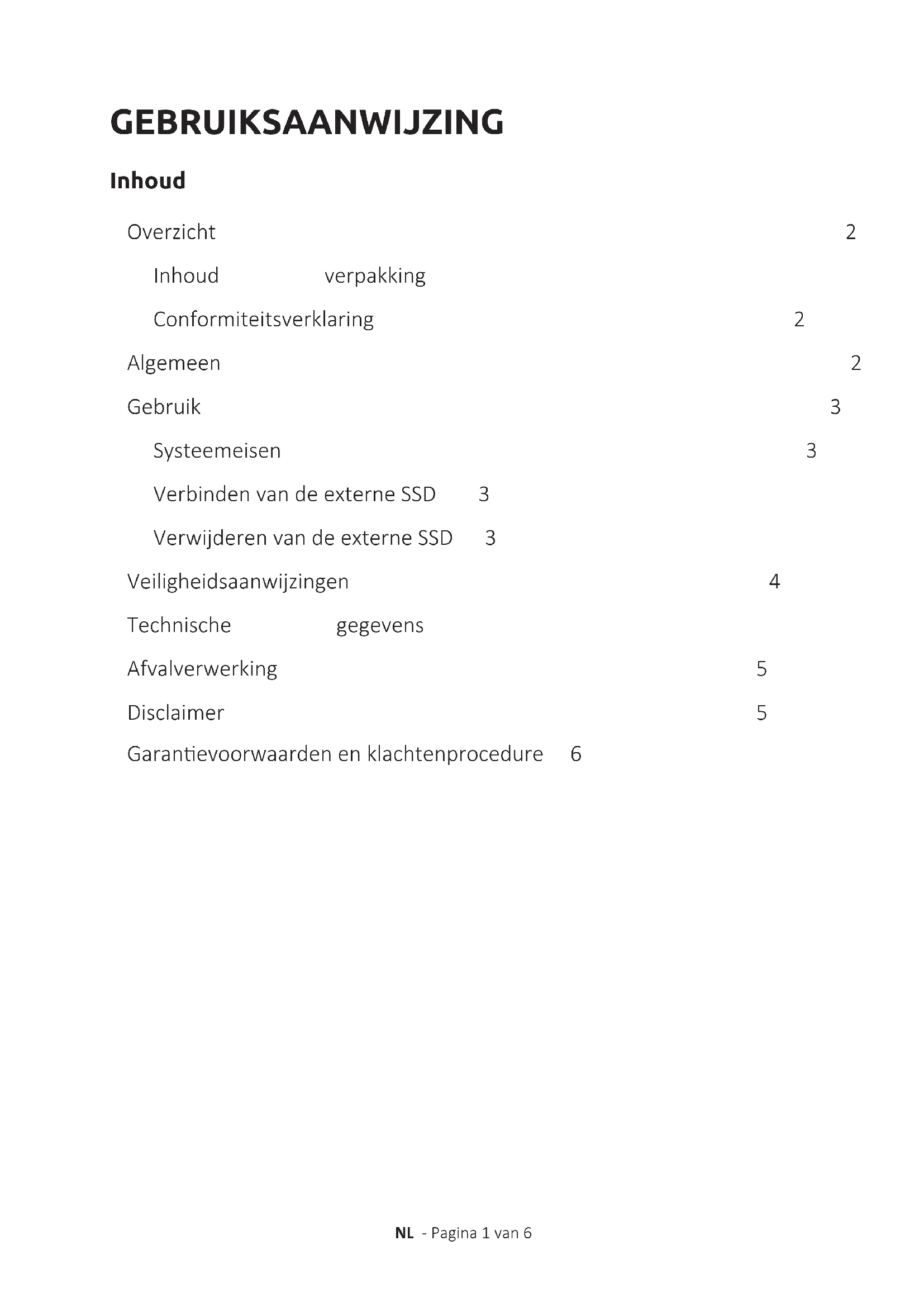 Service Center (votre n° RMA) Kopernikusstraße 12-14 D-49377 Vechta Contact: Email (assistance technique): support@intenso-internaonal.de Email (numéro RMA): rma@intenso-internaonal.de Internet: www.intenso-internaonal.de Assistance téléphonique: +49 (0) 900 –1 50 40 30 (0,39 €/min depuis un téléphone xe allemand. Les tarifs depuis un téléphone mobile peuvent diérer.) Procédure de réclamationGEBRUIKSAANWIJZING NL - Pagina 1 van 6 Inhoud Overzicht 2 Inhoud verpakking 2 Conformiteitsverklaring 2 Algemeen 2 Gebruik 3 Systeemeisen 3 Verbinden van de externe SSD 3 Verwijderen van de externe SSD 3 Veiligheidsaanwijzingen 4 Technische gegevens 5 Afvalverwerking 5 Disclaimer 5 Garanevoorwaarden en klachtenprocedure 6NL - Pagina 2 van 6 Lees deze gebruiksaanwijzing zorgvuldig door en neem alle in deze gebruiksaanwijzing vermelde aanwijzingen in acht en volg ze op, om een lange levensduur en betrouwbare werking van het apparaat te kunnen garanderen. Berg deze gebruiksaanwijzing onder handbereik op en geef deze door aan andere gebruikers van het apparaat. Over deze gebruiksaanwijzing ALGEMEEN Conformiteitsverklaring Het CE-merk gee aan dat dit product voldoet aan de vereisten van alle toepasselijke EU-richtlijnen voor dit product. Inhoud verpakking OVERZICHT Het hoofddoel van deze externe SSD is opslag van gegevens van pc‘s, notebooks, ultrabooks en Mac-computers. Dit product is niet bedoeld voor commercieel gebruik of voor medische en speciale toepassingen waarbij uitval van het product verwondingen, de dood of aanzienlijke zaakschade veroorzaken kan. In geval van gebruik dat niet overeenkomsg het doel is, vervalt garane en aansprakelijkheid. Openen en ombouwen van het apparaat en gebruik van randapparatuur en toebehoren die niet goedgekeurd zijn door ons dient achterwege gelaten te worden. Gebruik de externe SSD niet in extreme omgevingsomstandigheden en houd u aan de veiligheidsaanwijzingen. Als u de informae en de veiligheidsaanwijzingen in deze gebruiksaan- wijzing niet in acht neemt, dan geldt dat als niet in acht nemen van het doelovereenkomsg gebruik, wat leidt tot vervallen van de aansprakelijkheid en kan leiden tot personenschade en zaakschade. Gebruik overeenkomstig het doel