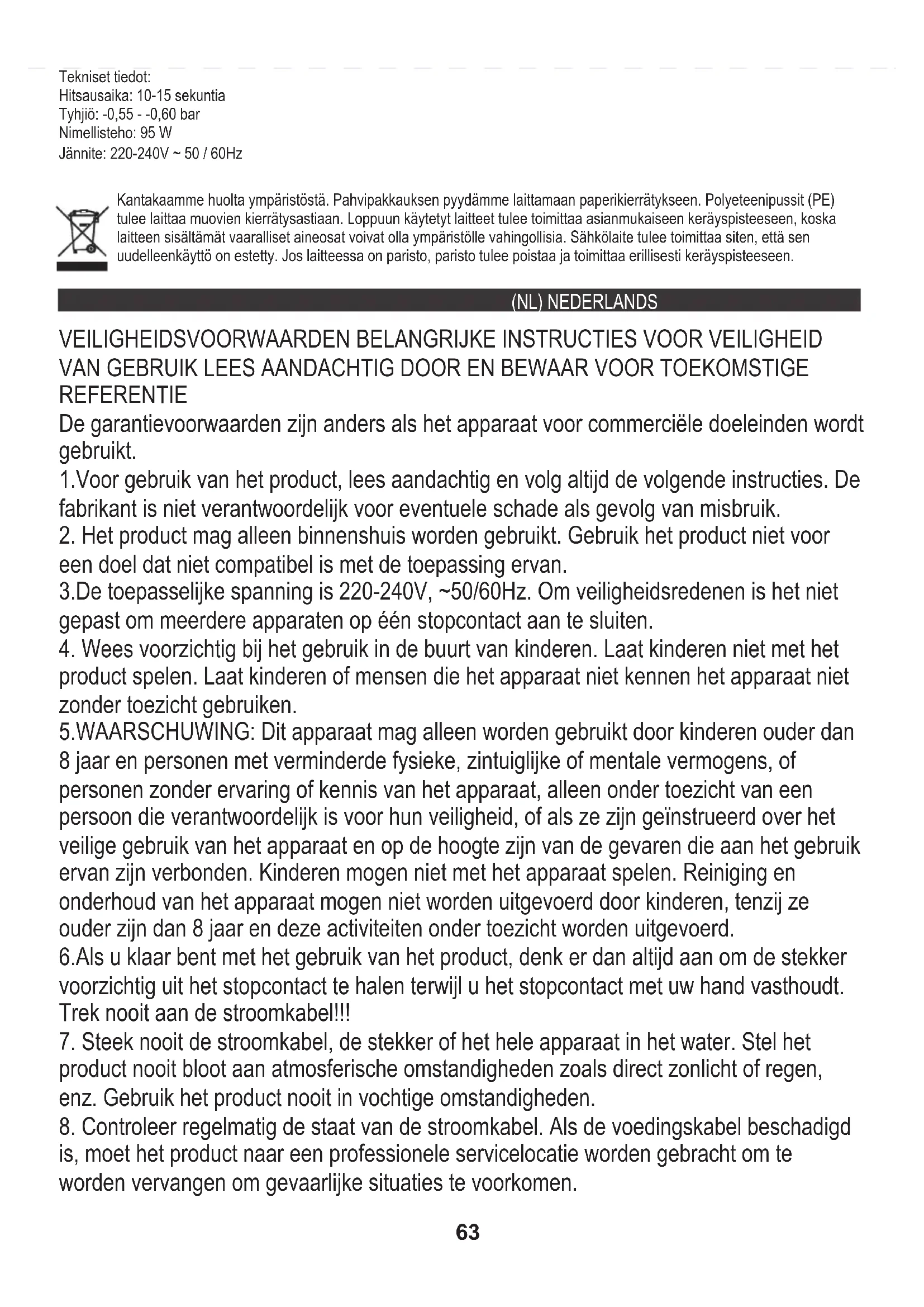 product spelen. Laat kinderen of mensen die het apparaat niet kennen het apparaat niet zonder toezicht gebruiken. De garantievoorwaarden zijn anders als het apparaat voor commerciële doeleinden wordt gebruikt. 5.WAARSCHUWING: Dit apparaat mag alleen worden gebruikt door kinderen ouder dan 8 jaar en personen met verminderde fysieke, zintuiglijke of mentale vermogens, of personen zonder ervaring of kennis van het apparaat, alleen onder toezicht van een persoon die verantwoordelijk is voor hun veiligheid, of als ze zijn geïnstrueerd over het veilige gebruik van het apparaat en op de hoogte zijn van de gevaren die aan het gebruik ervan zijn verbonden. Kinderen mogen niet met het apparaat spelen. Reiniging en onderhoud van het apparaat mogen niet worden uitgevoerd door kinderen, tenzij ze ouder zijn dan 8 jaar en deze activiteiten onder toezicht worden uitgevoerd.