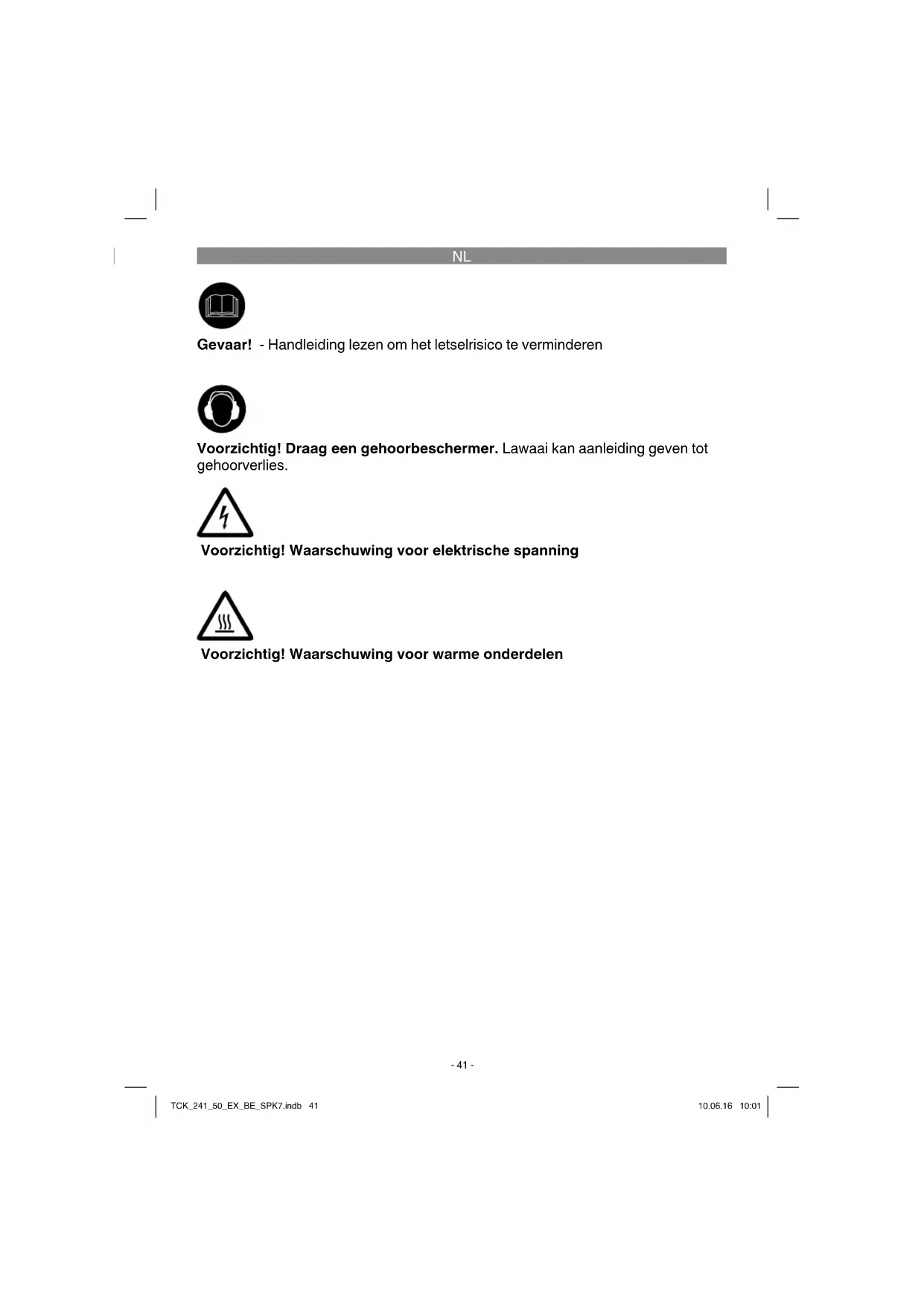 Gevaar! - Handleiding lezen om het letselrisico te verminderen Voorzichtig! Draag een gehoorbeschermer. Lawaai kan aanleiding geven tot gehoorverlies. Voorzichtig! Waarschuwing voor elektrische spanning Voorzichtig! Waarschuwing voor warme onderdelen TCK_241_50_EX_BE_SPK7.indb 41TCK_241_50_EX_BE_SPK7.indb 41 10.06.16 10:0110.06.16 10:01NL