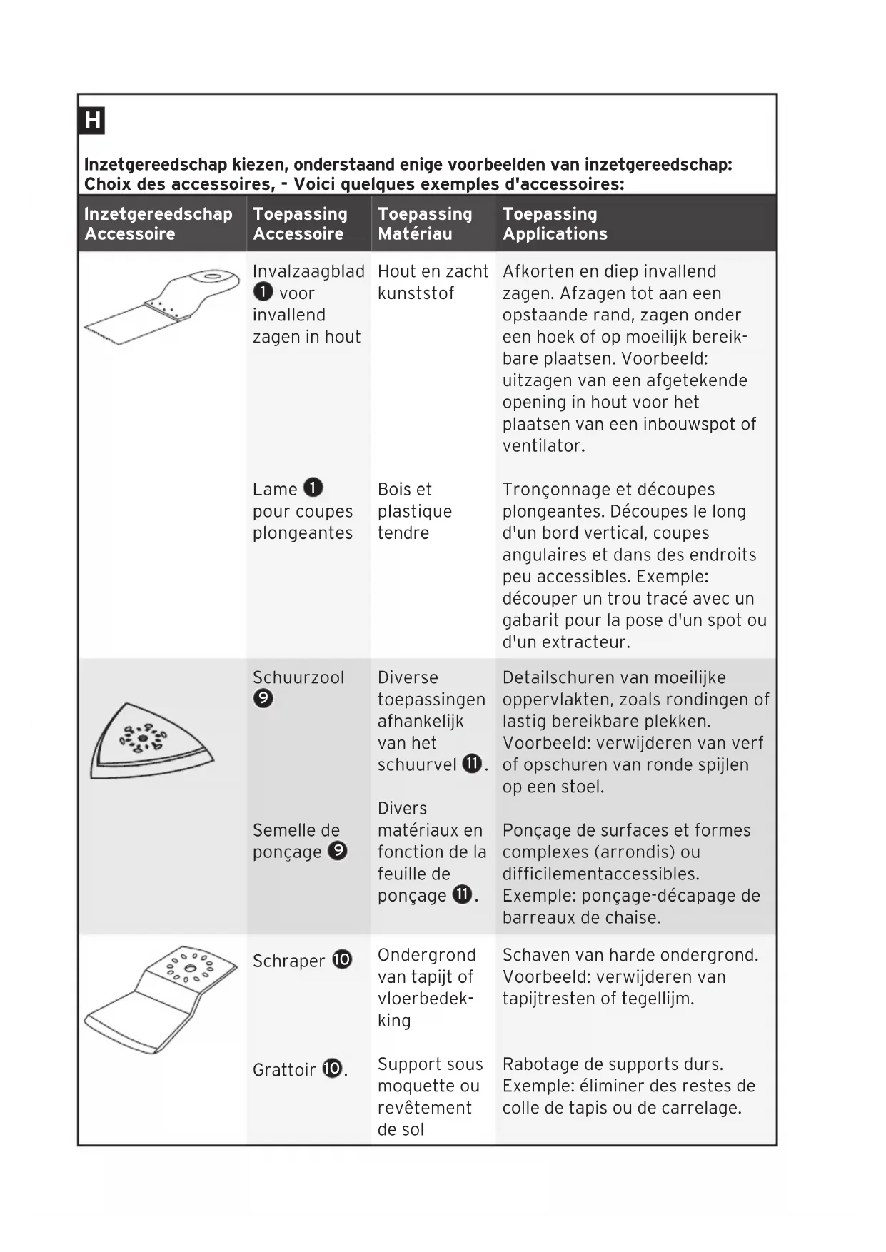 Inzetgereedschap De keus van het inzetgereedschap is afhankelijk van het type klus. Er zijn tal van extra accessoires verkrijg- baar voor o.a. schaven van lakkeringen - lijmstoffen, tegelzagen, raspen, verwijde- ren cementresten - lijmresten - voegen, diverse afkorttoepassingen en maken van uitsparingen. Bekijk hiervoor onze website of bezoek een bouwmarkt voor het juiste advies.