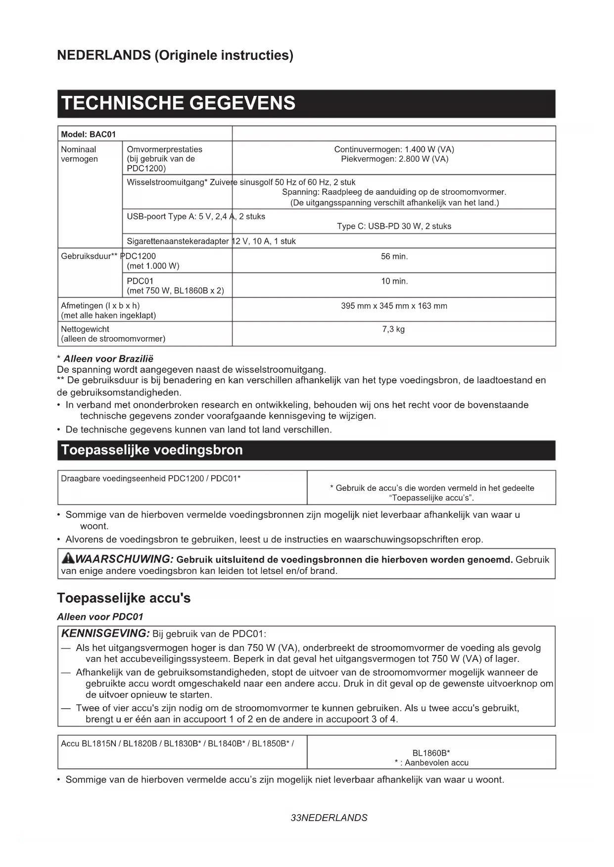 - MAKPAC NOTA: Alcuni articoli nell’elenco potrebbero essere inclusi nell’imballaggio dell’utensile come accessori standard. Tali articoli potrebbero variare da nazione a nazione.33 NEDERLANDS NEDERLANDS (Originele instructies) TECHNISCHE GEGEVENS Model: BAC01 Nominaal vermogen Omvormerprestaties (bij gebruik van de PDC1200) Continuvermogen: 1.400 W (VA) Piekvermogen: 2.800 W (VA) Wisselstroomuitgang* Zuivere sinusgolf 50 Hz of 60 Hz, 2 stuk Spanning: Raadpleeg de aanduiding op de stroomomvormer. (De uitgangsspanning verschilt afhankelijk van het land.) USB-poort Type A: 5 V, 2,4 A, 2 stuks Type C: USB-PD 30 W, 2 stuks Sigarettenaanstekeradapter 12 V, 10 A, 1 stuk Gebruiksduur** PDC1200 (met 1.000 W) 56 min. PDC01 (met 750 W, BL1860B x 2) 10 min. Afmetingen (l x b x h) (met alle haken ingeklapt) 395 mm x 345 mm x 163 mm Nettogewicht (alleen de stroomomvormer) 7,3 kg