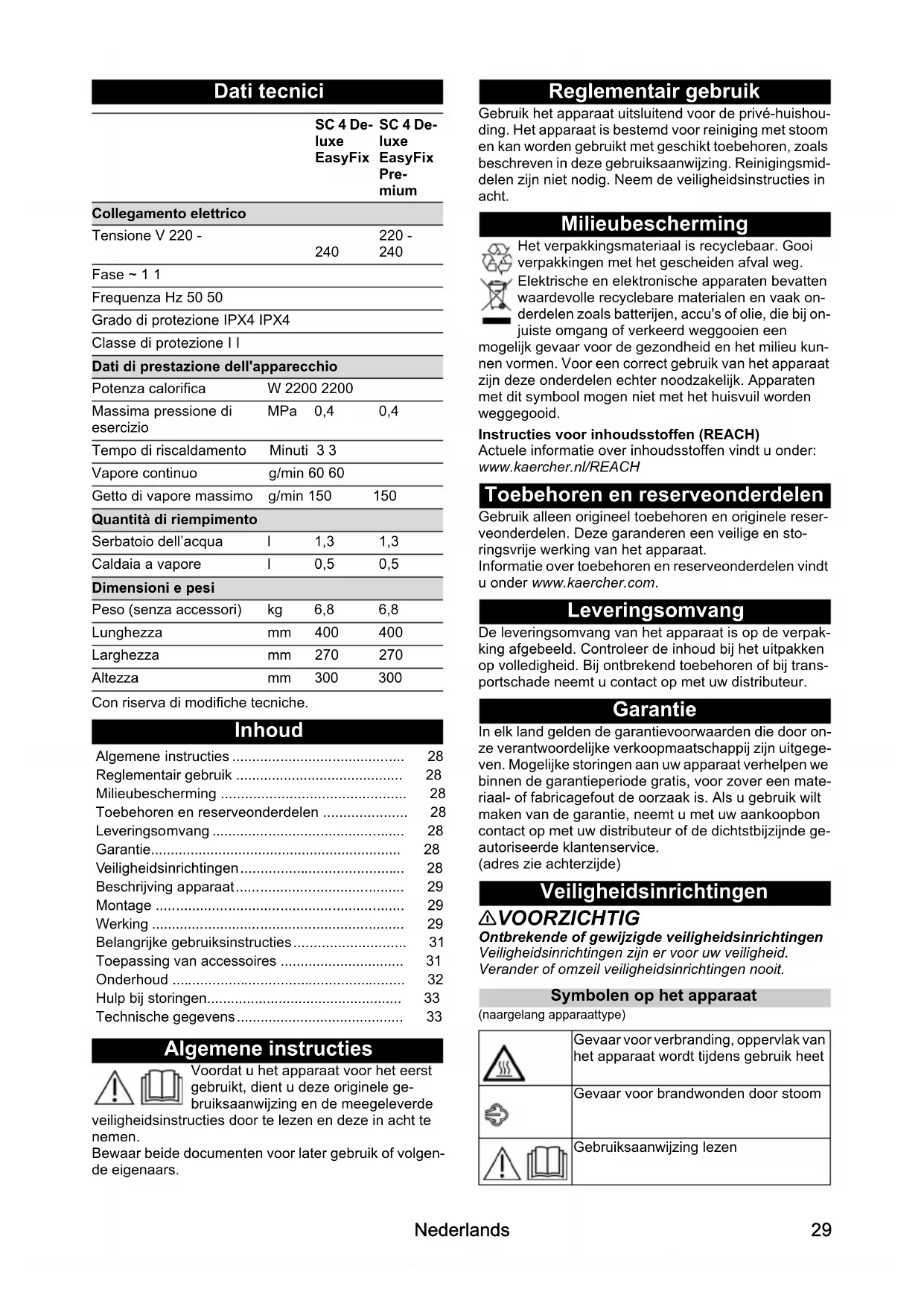 a caldaia a vapore presenta incrostazioni di calcare. Decalcificare la caldaia a vapore. Elevata fuoriuscita d’acqua La caldaia a vapore presenta incrostazioni di calcare. Decalcificare la caldaia a vapore. Campo di durezza °dH mmol/l TF I dolce 0 - 7 0 - 1,3 100 II media 7 - 14 1,3 - 2,5 90 III dura 14 - 21 2,5 - 3,8 75 IV molto dura >21 >3,8 5029 Nederlands Dati tecnici Con riserva di modifiche tecniche. Inhoud Algemene instructies Voordat u het apparaat voor het eerst gebruikt, dient u deze originele ge- bruiksaanwijzing en de meegeleverde veiligheidsinstructies door te lezen en deze in acht te nemen. Bewaar beide documenten voor later gebruik of volgen- de eigenaars. Reglementair gebruik Gebruik het apparaat uitsluitend voor de privé-huishou- ding. Het apparaat is bestemd voor reiniging met stoom en kan worden gebruikt met geschikt toebehoren, zoals beschreven in deze gebruiksaanwijzing. Reinigingsmid- delen zijn niet nodig. Neem de veiligheidsinstructies in acht. Milieubescherming Het verpakkingsmateriaal is recyclebaar. Gooi verpakkingen met het gescheiden afval weg. Elektrische en elektronische apparaten bevatten waardevolle recyclebare materialen en vaak on- derdelen zoals batterijen, accu's of olie, die bij on- juiste omgang of verkeerd weggooien een mogelijk gevaar voor de gezondheid en het milieu kun- nen vormen. Voor een correct gebruik van het apparaat zijn deze onderdelen echter noodzakelijk. Apparaten met dit symbool mogen niet met het huisvuil worden weggegooid. Instructies voor inhoudsstoffen (REACH) Actuele informatie over inhoudsstoffen vindt u onder: www.kaercher.nl/REACH Toebehoren en reserveonderdelen Gebruik alleen origineel toebehoren en originele reser- veonderdelen. Deze garanderen een veilige en sto- ringsvrije werking van het apparaat. Informatie over toebehoren en reserveonderdelen vindt u onder www.kaercher.com. Leveringsomvang De leveringsomvang van het apparaat is op de verpak- king afgebeeld. Controleer de inhoud bij het uitpakken op volledigheid. Bij ontbrekend toebehoren of bij trans- portschade neemt u contact op met uw distributeur. Garantie In elk land gelden de garantievoorwaarden die door on- ze verantwoordelijke verkoopmaatschappij zijn uitgege- ven. Mogelijke storingen aan uw apparaat verhelpen we binnen de garantieperiode gratis, voor zover een mate- riaal- of fabricagefout de oorzaak is. Als u gebruik wilt maken van de garantie, neemt u met uw aankoopbon contact op met uw distributeur of de dichtstbijzijnde ge- autoriseerde klantenservice. (adres zie achterzijde) Veiligheidsinrichtingen 몇 VOORZICHTIG Ontbrekende of gewijzigde veiligheidsinrichtingen Veiligheidsinrichtingen zijn er voor uw veiligheid. Verander of omzeil veiligheidsinrichtingen nooit. Symbolen op het apparaat (naargelang apparaattype) SC 4 De- luxe EasyFix SC 4 De- luxe EasyFix Pre- mium Collegamento elettrico Tensione V 220 -