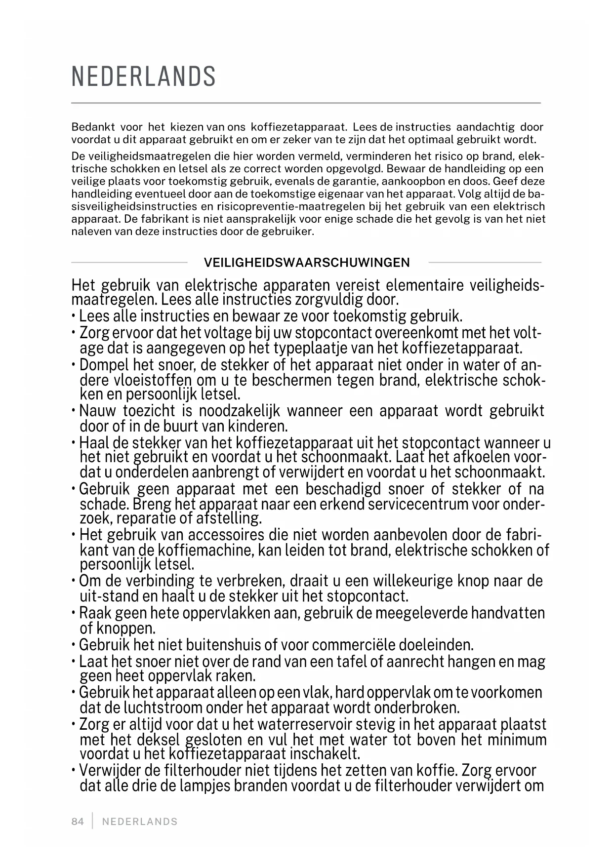 en Mahlgrad. Die drei Bedienfeld- leuchten blinken alternativ. Der Wassertank hat kein Wasser mehr. Wasser in den Vorratsbehälter geben.84 NEDERLANDS NEDERLANDS VEILIGHEIDSWAARSCHUWINGEN Bedankt voor het kiezen van ons kofezetapparaat. Lees de instructies aandachtig door voordat u dit apparaat gebruikt en om er zeker van te zijn dat het optimaal gebruikt wordt. De veiligheidsmaatregelen die hier worden vermeld, verminderen het risico op brand, elek- trische schokken en letsel als ze correct worden opgevolgd. Bewaar de handleiding op een veilige plaats voor toekomstig gebruik, evenals de garantie, aankoopbon en doos. Geef deze handleiding eventueel door aan de toekomstige eigenaar van het apparaat. Volg altijd de ba- sisveiligheidsinstructies en risicopreventie-maatregelen bij het gebruik van een elektrisch apparaat. De fabrikant is niet aansprakelijk voor enige schade die het gevolg is van het niet naleven van deze instructies door de gebruiker. Het gebruik van elektrische apparaten vereist elementaire veiligheids- maatregelen. Lees alle instructies zorgvuldig door.