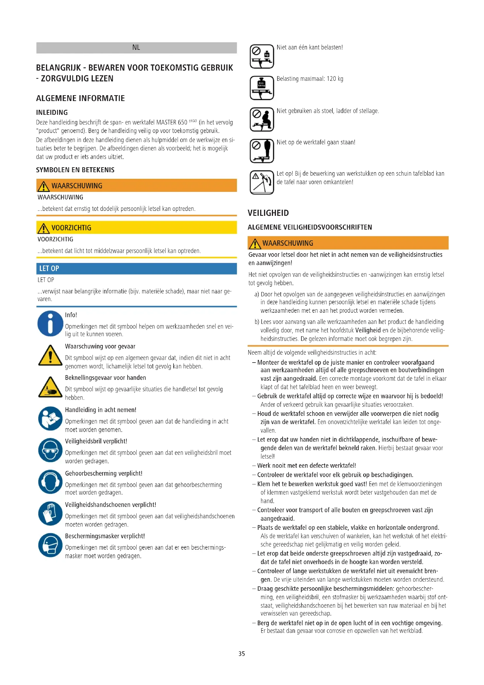 - ZORGVULDIG LEZEN ALGEMENE INFORMATIE INLEIDING Deze handleiding beschrijft de span- en werktafel MASTER 650 ERGO (in het vervolg "product" genoemd). Berg de handleiding veilig op voor toekomstig gebruik. De afbeeldingen in deze handleiding dienen als hulpmiddel om de werkwijze en si- tuaties beter te begrijpen. De afbeeldingen dienen als voorbeeld; het is mogelijk dat uw product er iets anders uitziet.