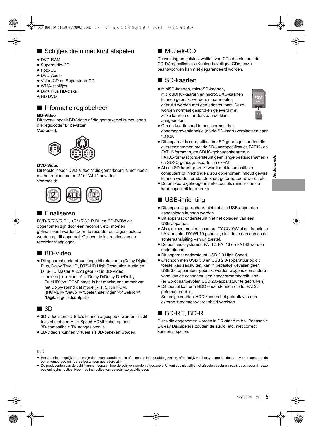 ∫ Finaliseren DVD-R/RW/R DL, +R/+RW/+R DL en CD-R/RW die opgenomen zijn door een recorder, etc. moeten gefinaliseerd worden door de recorder om afgespeeld te worden op dit apparaat. Gelieve de instructies van de recorder raadplegen. ∫ BD-Video ≥ Dit apparaat ondersteunt hoge bit rate audio (Dolby Digital Plus, Dolby TrueHD, DTS-HD High Resolution Audio en DTS-HD Master Audio) gebruikt in BD-Video. – [BDT111] [BDT110] : Als “Dolby D/Dolby D +/Dolby TrueHD” op “PCM” staat, is het maximumnummer van het Dolby-sound dat mogelijk is, 5.1ch PCM. ([HOME]>“Setup”>“Spelerinstellingen”>“Geluid”> “Digitale geluidsoutput”) ∫ 3D ≥ 3D-video’s en 3D-foto’s kunnen afgespeeld worden als dit toestel met een High Speed HDMI-kabel op een 3D-compatibele TV aangesloten is. ≥ 2D-video’s kunnen virtueel als 3D-bekeken worden. ≥ miniSD-kaarten, microSD-kaarten, microSDHC-kaarten en microSDXC-kaarten kunnen gebruikt worden, maar moeten gebruikt worden met een adapterkaart. Deze worden normaal gesproken geleverd met zulke kaarten of anders aan de klant aangeboden. ≥ Om de kaartinhoud te beschermen, het opnamepreventienokje (op de SD-kaart) verplaatsen naar “LOCK”. ≥ Dit apparaat is compatibel met SD-geheugenkaarten die overeenstemmen met de SD-kaartspecificaties FAT12- en FAT16-formaten, en SDHC-geheugenkaarten in FAT32-formaat (ondersteunt geen lange bestandsnamen.) en SDXC-geheugenkaarten in exFAT. ≥ Als de SD-kaart gebruikt wordt met incompatibele computers of inrichtingen, zou opgenomen inhoud gewist kunnen worden omdat de kaart geformatteerd wordt, etc. ≥ De bruikbare geheugenruimte zou iets minder dan de kaartcapaciteit kunnen zijn. ∫ USB-inrichting ≥ Dit apparaat garandeert niet dat alle USB-apparaten aangesloten kunnen worden. ≥ Dit apparaat ondersteunt niet het opladen van een USB-apparaat. ≥ Als u de communicatiecamera TY-CC10W of de draadloze LAN-adapter DY-WL10 gebruikt, sluit deze dan aan op de achteraansluiting van dit toestel. ≥ De bestandssystemen FAT12, FAT16 en FAT32 worden ondersteund. ≥ Dit apparaat ondersteunt USB 2.0 High Speed. ≥ Ofschoon men USB 3.0 en USB 2.0-apparatuur op dit toestel kan aansluiten, kan in bepaalde gevallen geen USB 3.0-apparatuur gebruikt worden wegens een andere vorm van de connector, een hoger stroombereik, enz. (er wordt aanbevolen USB 2.0-apparatuur te gebruiken). ≥ Dit toestel kan een HDD ondersteunen die tot FAT32 geformatteerd is. Sommige soorten HDD kunnen het gebruik van een externe stroomtoevoereenheid vereisen. ∫ BD-RE, BD-R Discs die opgenomen worden in DR-stand m.b.v. Panasonic Blu-ray Discspelers zouden de audio, etc. niet correct kunnen afspelen. ≥ Het zou niet mogelijk kunnen zijn de bovenstaande media af te spelen in bepaalde gevallen, afhankelijk van het type media, de staat van de opname, de opnamemethode en hoe de bestanden gecreëerd zijn. ≥ De producenten van de schijf kunnen bepalen hoe de schijven worden afgespeeld. U kunt dus niet altijd het afspelen besturen zoals beschreven in deze bedieningsinstructies. Neem de instructies van de schijf zorgvuldig door. VQT3B62 (53)