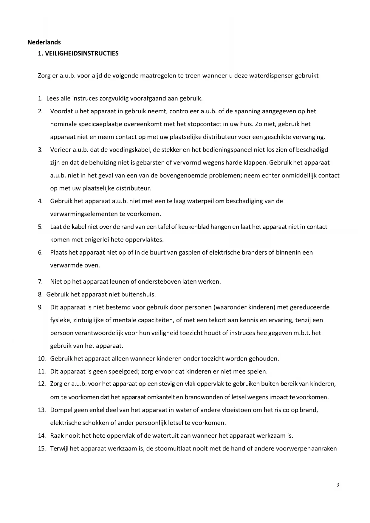 17. Gebruik het apparaat niet om iets anders dan water te verwarmen. Vul het apparaat niet tot boven de