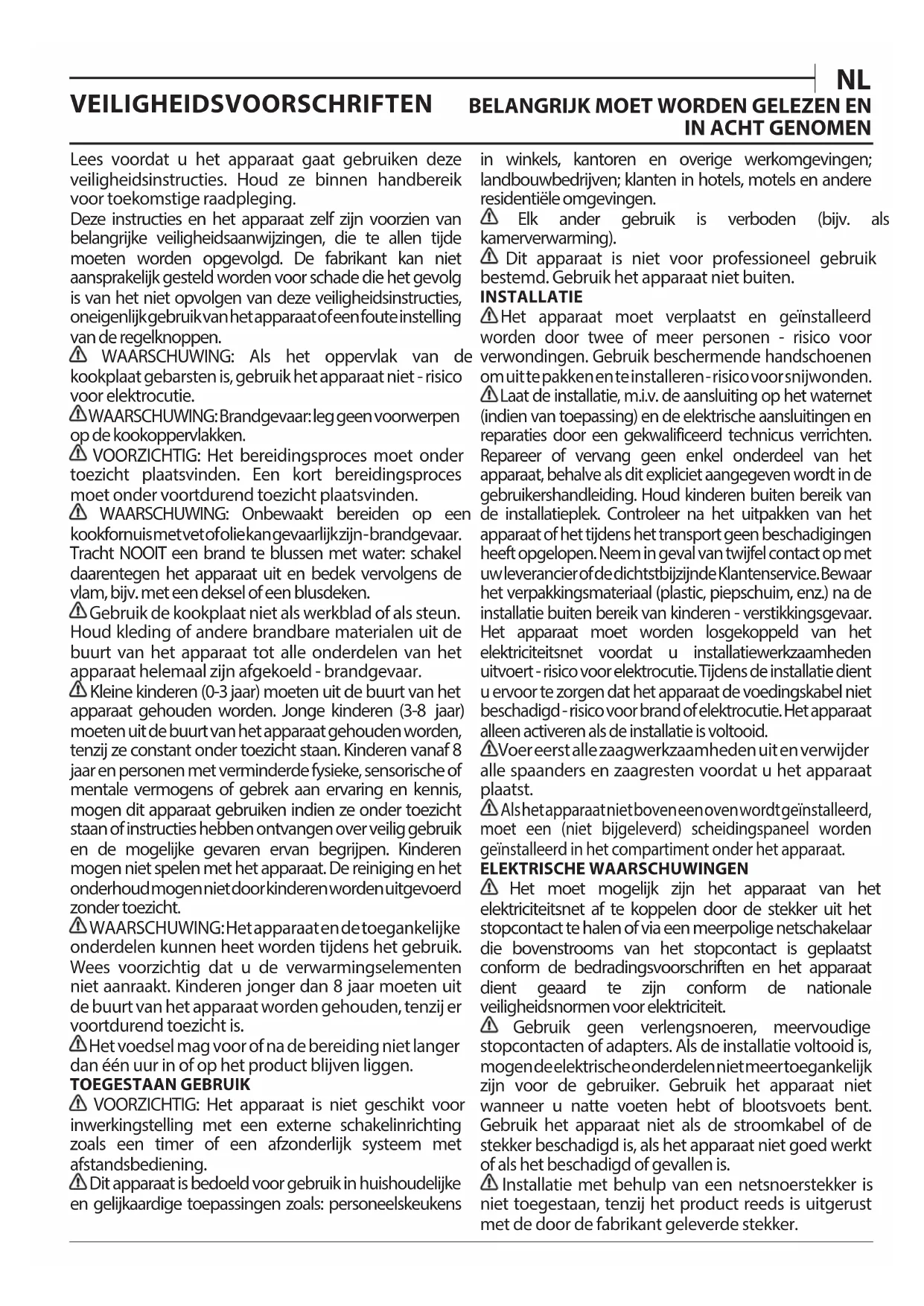 Lees voordat u het apparaat gaat gebruiken deze veiligheidsinstructies. Houd ze binnen handbereik voor toekomstige raadpleging. Deze instructies en het apparaat zelf zijn voorzien van belangrijke veiligheidsaanwijzingen, die te allen tijde moeten worden opgevolgd. De fabrikant kan niet aansprakelijk gesteld worden voor schade die het gevolg is van het niet opvolgen van deze veiligheidsinstructies, oneigenlijk gebruik van het apparaat of een foute instelling van de regelknoppen. WAARSCHUWING: Als het oppervlak van de kookplaat gebarsten is, gebruik het apparaat niet- risico voor elektrocutie. WAARSCHUWING: Brandgevaar: leg geen voorwerpen op de kookoppervlakken. VOORZICHTIG: Het bereidingsproces moet onder toezicht plaatsvinden. Een kort bereidingsproces moet onder voortdurend toezicht plaatsvinden. WAARSCHUWING: Onbewaakt bereiden op een kookfornuis met vet of olie kan gevaarlijk zijn - brandgevaar. Tracht NOOIT een brand te blussen met water: schakel daarentegen het apparaat uit en bedek vervolgens de vlam, bijv. met een deksel of een blusdeken. Gebruik de kookplaat niet als werkblad of als steun. Houd kleding of andere brandbare materialen uit de buurt van het apparaat tot alle onderdelen van het apparaat helemaal zijn afgekoeld - brandgevaar. Kleine kinderen (0-3jaar) moeten uit de buurt van het apparaat gehouden worden. Jonge kinderen (3-8 jaar) moeten uit de buurt van het apparaat gehouden worden, tenzij ze constant onder toezicht staan. Kinderen vanaf 8 jaar en personen met verminderde fysieke, sensorische of mentale vermogens of gebrek aan ervaring en kennis, mogen dit apparaat gebruiken indien ze onder toezicht staan of instructies hebben ontvangen over veilig gebruik en de mogelijke gevaren ervan begrijpen. Kinderen mogen niet spelen met het apparaat. De reiniging en het onderhoud mogen niet door kinderen worden uitgevoerd zonder toezicht. WAARSCHUWING: Het apparaat en de toegankelijke onderdelen kunnen heet worden tijdens het gebruik. Wees voorzichtig dat u de verwarmingselementen niet aanraakt. Kinderen jonger dan 8 jaar moeten uit de buurt van het apparaat worden gehouden, tenzij er voortdurend toezicht is. Het voedsel mag voor of na de bereiding niet langer dan één uur in of op het product blijven liggen. TOEGESTAAN GEBRUIK VOORZICHTIG: Het apparaat is niet geschikt voor inwerkingstelling met een externe schakelinrichting zoals een timer of een afzonderlijk systeem met afstandsbediening. Dit apparaat is bedoeld voor gebruik in huishoudelijke en gelijkaardige toepassingen zoals: personeelskeukens in winkels, kantoren en overige werkomgevingen; landbouwbedrijven; klanten in hotels, motels en andere residentiële omgevingen. Elk ander gebruik is verboden (bijv. als kamerverwarming). Dit apparaat is niet voor professioneel gebruik bestemd. Gebruik het apparaat niet buiten. INSTALLATIE Het apparaat moet verplaatst en geïnstalleerd worden door twee of meer personen - risico voor verwondingen. Gebruik beschermende handschoenen om uit te pakken en te installeren - risico voor snijwonden. Laat de installatie, m.i.v. de aansluiting op het waternet (indien van toepassing) en de elektrische aansluitingen en reparaties door een gekwalificeerd technicus verrichten. Repareer of vervang geen enkel onderdeel van het apparaat, behalve als dit expliciet aangegeven wordt in de gebruikershandleiding. Houd kinderen buiten bereik van de installatieplek. Controleer na het uitpakken van het apparaat of het tijdens het transport geen beschadigingen heeft opgelopen. Neem in geval van twijfel contact op met uw leverancier of de dichtstbijzijnde Klantenservice. Bewaar het verpakkingsmateriaal (plastic, piepschuim, enz.) na de installatie buiten bereik van kinderen - verstikkingsgevaar. Het apparaat moet worden losgekoppeld van het elektriciteitsnet voordat u installatiewerkzaamheden uitvoert - risico voor elektrocutie. Tijdens de installatie dient u ervoor te zorgen dat het apparaat de voedingskabel niet beschadigd - risico voor brand of elektrocutie. Het apparaat alleen activeren als de installatie is voltooid. Voer eerst alle zaagwerkzaamheden uit en verwijder alle spaanders en zaagresten voordat u het apparaat plaatst. Als het apparaat niet boven een oven wordt geïnstalleerd, moet een (niet bijgeleverd) scheidingspaneel worden geïnstalleerd in het compartiment onder het apparaat. ELEKTRISCHE WAARSCHUWINGEN Het moet mogelijk zijn het apparaat van het elektriciteitsnet af te koppelen door de stekker uit het stopcontact te halen of via een meerpolige netschakelaar die bovenstrooms van het stopcontact is geplaatst conform de bedradingsvoorschriften en het apparaat dient geaard te zijn conform de nationale veiligheidsnormen voor elektriciteit. Gebruik geen verlengsnoeren, meervoudige stopcontacten of adapters. Als de installatie voltooid is, mogen de elektrische onderdelen niet meer toegankelijk zijn voor de gebruiker. Gebruik het apparaat niet wanneer u natte voeten hebt of blootsvoets bent. Gebruik het apparaat niet als de stroomkabel of de stekker beschadigd is, als het apparaat niet goed werkt of als het beschadigd of gevallen is. Installatie met behulp van een netsnoerstekker is niet toegestaan, tenzij het product reeds is uitgerust met de door de fabrikant geleverde stekker.Als het netsnoer beschadigd is, moet het vervangen worden door de fabrikant, een servicevertegenwoordiger of gekwalificeerd personeel om risico’s te voorkomen - risico voor elektrocutie.