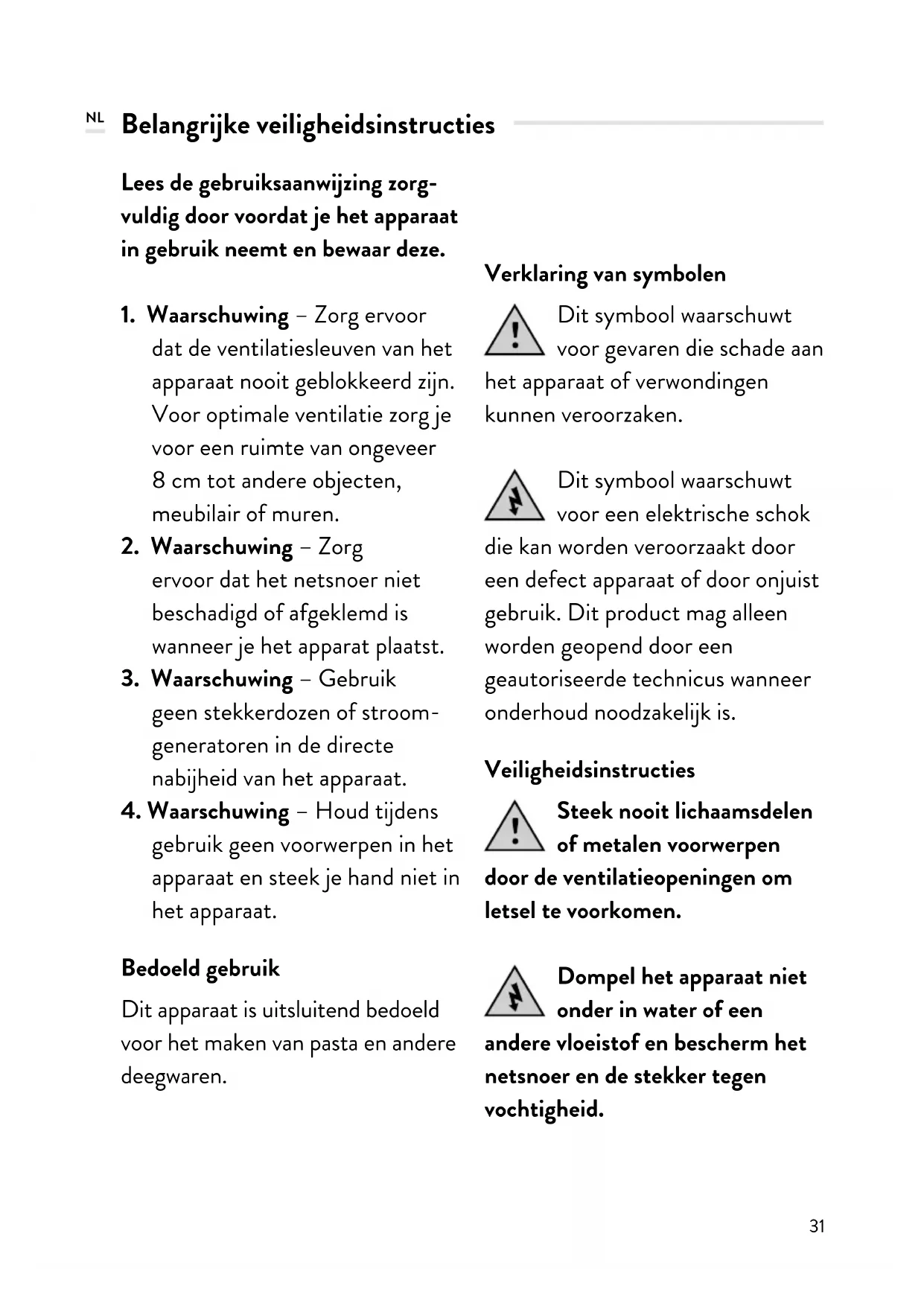 gebruik geen voorwerpen in het apparaat en steek je hand niet in het apparaat. Bedoeld gebruik Dit apparaat is uitsluitend bedoeld voor het maken van pasta en andere deegwaren. Verklaring van symbolen Dit symbool waarschuwt voor gevaren die schade aan het apparaat of verwondingen kunnen veroorzaken. Dit symbool waarschuwt voor een elektrische schok die kan worden veroorzaakt door een defect apparaat of door onjuist gebruik. Dit product mag alleen worden geopend door een geautoriseerde technicus wanneer onderhoud noodzakelijk is. Veiligheidsinstructies Steek nooit lichaamsdelen of metalen voorwerpen door de ventilatieopeningen om letsel te voorkomen. Dompel het apparaat niet onder in water of een andere vloeistof en bescherm het netsnoer en de stekker tegen vochtigheid. NL32