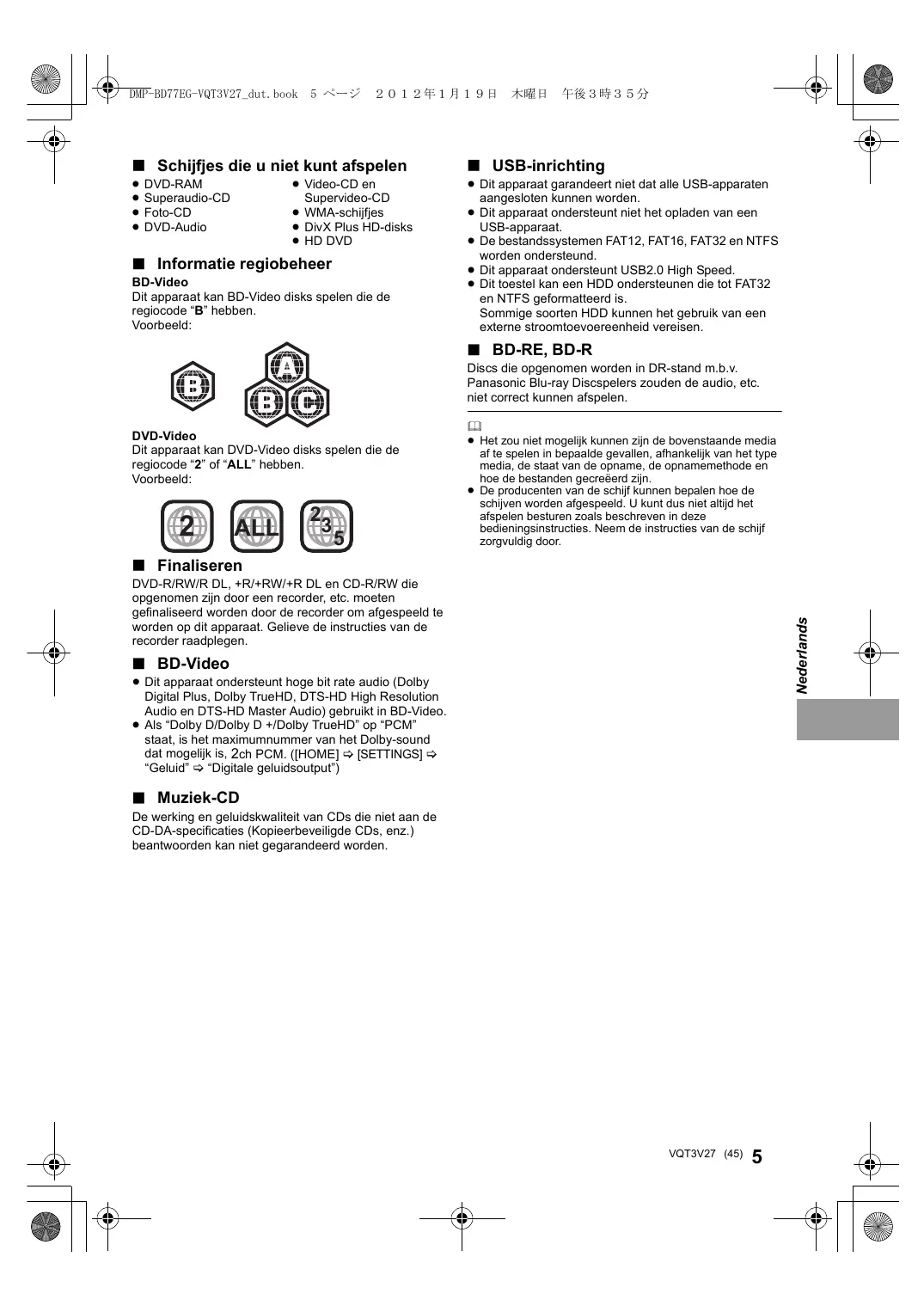 ≥ Het zou niet mogelijk kunnen zijn de bovenstaande media af te spelen in bepaalde gevallen, afhankelijk van het type media, de staat van de opname, de opnamemethode en hoe de bestanden gecreëerd zijn. ≥ De producenten van de schijf kunnen bepalen hoe de schijven worden afgespeeld. U kunt dus niet altijd het afspelen besturen zoals beschreven in deze bedieningsinstructies. Neem de instructies van de schijf zorgvuldig door. ∫ Finaliseren Nederlands DVD-R/RW/R DL, +R/+RW/+R DL en CD-R/RW die opgenomen zijn door een recorder, etc. moeten gefinaliseerd worden door de recorder om afgespeeld te worden op dit apparaat. Gelieve de instructies van de recorder raadplegen. ∫ BD-Video ≥ Dit apparaat ondersteunt hoge bit rate audio (Dolby Digital Plus, Dolby TrueHD, DTS-HD High Resolution Audio en DTS-HD Master Audio) gebruikt in BD-Video. ≥ Als “Dolby D/Dolby D +/Dolby TrueHD” op “PCM” staat, is het maximumnummer van het Dolby-sound dat mogelijk is, 2ch PCM. ([HOME] > [SETTINGS] > “Geluid” > “Digitale geluidsoutput”) ∫ Muziek-CD De werking en geluidskwaliteit van CDs die niet aan de CD-DA-specificaties (Kopieerbeveiligde CDs, enz.) beantwoorden kan niet gegarandeerd worden. VQT3V27 (45)