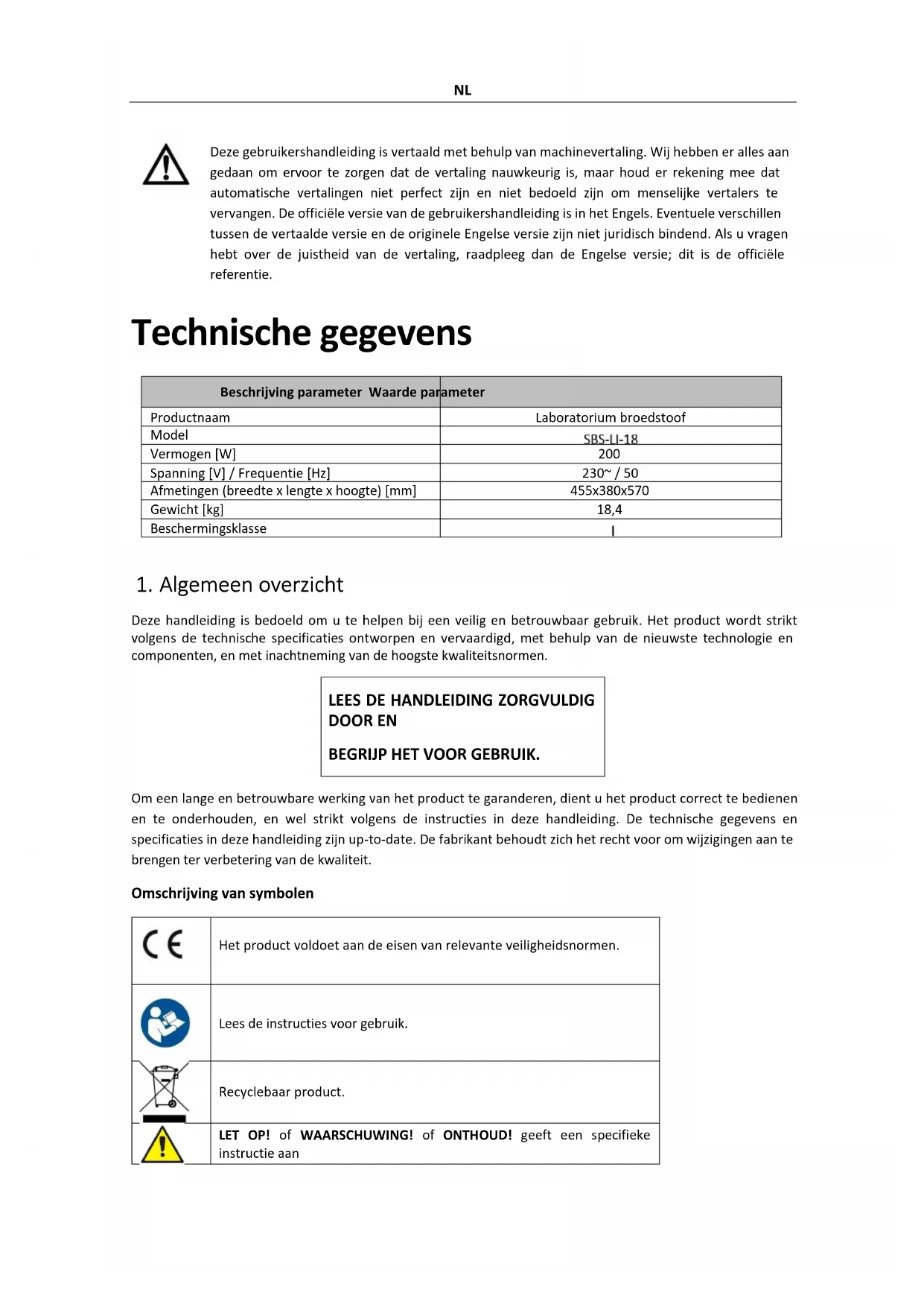 uitvoeren zonder toezicht van een volwassene. j) Probeer nooit het apparaat te manipuleren om de parameters of structuur ervan te wijzigen. k) Houd het apparaat uit de buurt van vuur- en warmtebronnen. l) Dek de ventilatieopeningen van het apparaat niet af! m) Gebruik geen ontvlambare of explosieve organische oplosmiddelen tijdens het gebruik van het apparaat.NL n) Plaats geen vluchtige stoffen in het apparaat wanneer het in werking is. o) Oefen geen mechanische druk uit op het apparaat en stel het niet bloot aan schokken of vallen. p) Plaats geen voorwerpen op het apparaat. q) Verplaats het apparaat niet als er zich monsters in bevinden. Indien het apparaat verplaatst moet worden, koppel het dan eerst los van de stroomvoorziening en gebruik beide handen om de broedmachine te verplaatsen terwijl u deze waterpas houdt. r) Als er een functie uitvalt, stop dan onmiddellijk het incubatieproces. Onjuiste bedrijfsomstandigheden kunnen schadelijke effecten op de inhoud van het monster tot gevolg hebben. LET OP! Hoewel het apparaat zo is ontworpen dat het veilig is en is voorzien van voldoende beveiligingen, en ondanks het gebruik van aanvullende veiligheidsmaatregelen, is er nog steeds een laag restrisico op ongelukken of verwondingen tijdens het gebruik ervan. Blijf alert en gebruik uw gezond verstand wanneer u het apparaat gebruikt.