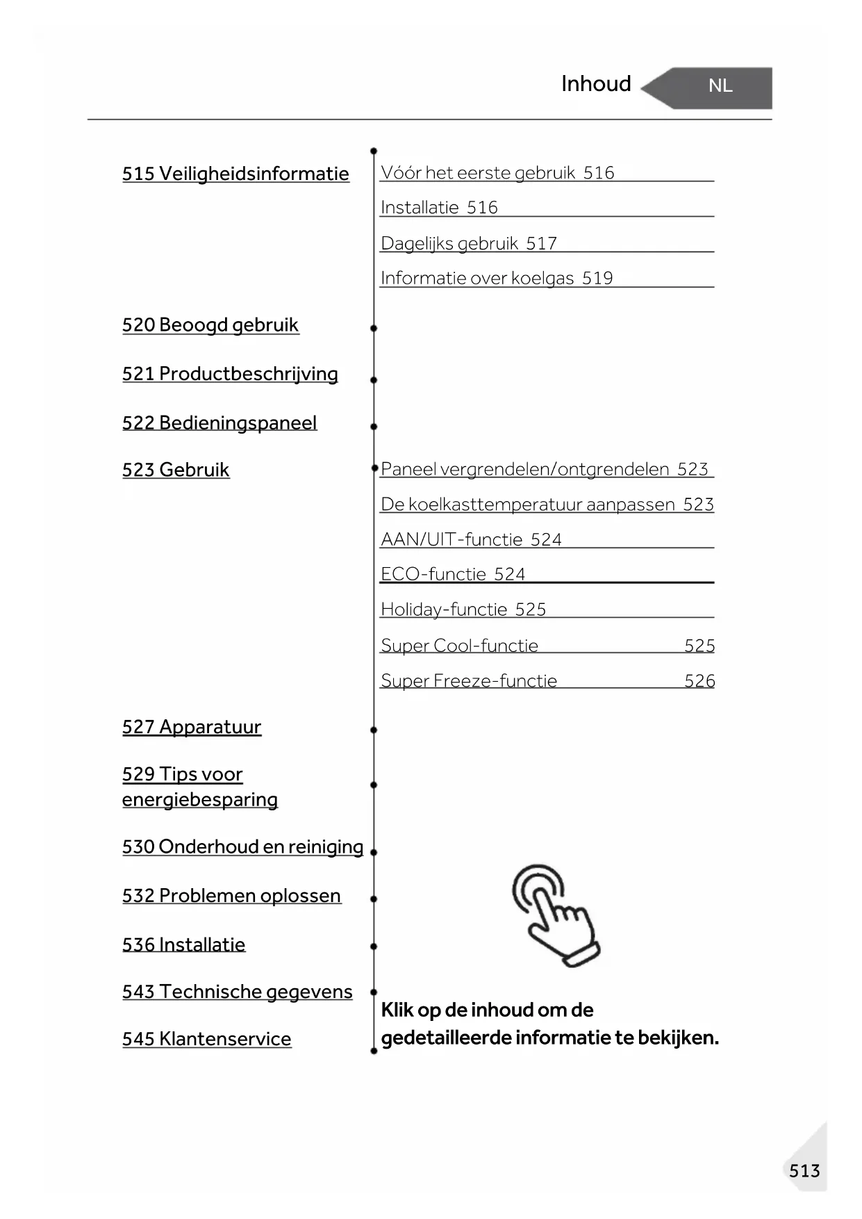 Inhoud 515 Veiligheidsinformatie Vóór het eerste gebruik 516 Installatie 516 Dagelijks gebruik 517 Informatie over koelgas 519 520 Beoogd gebruik