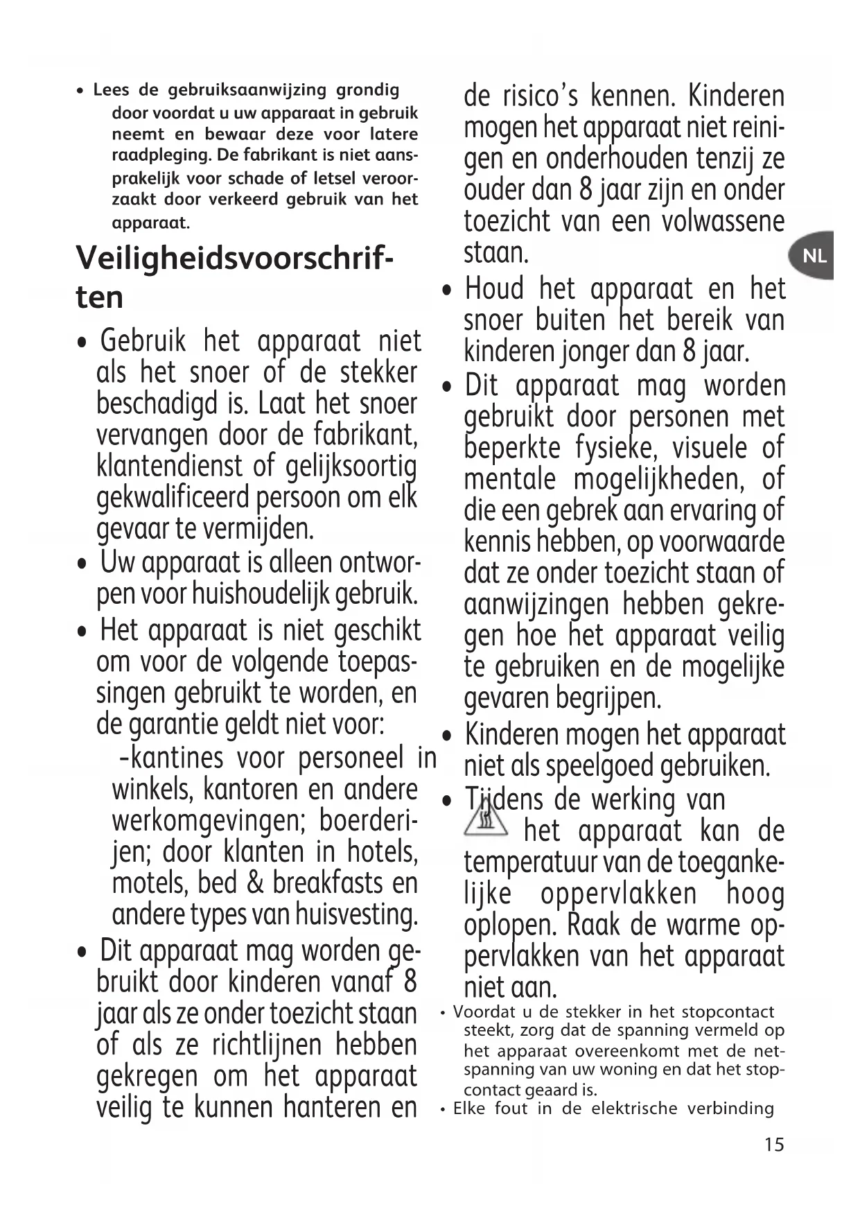 - Dit apparaat mag worden ge- bruikt door kinderen vanaf 8 jaar als ze onder toezicht staan of als ze richtlijnen hebben gekregen om het apparaat veilig te kunnen hanteren en de risico’s kennen. Kinderen mogen het apparaat niet reini- gen en onderhouden tenzij ze ouder dan 8 jaar zijn en onder toezicht van een volwassene staan.