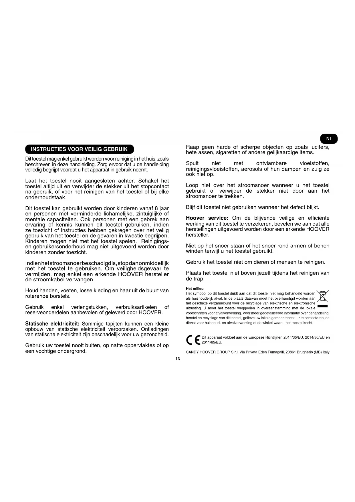 Dit toestel mag enkel gebruikt worden voor reiniging in het huis, zoals beschreven in deze handleiding. Zorg ervoor dat u de handleiding volledig begrijpt voordat u het apparaat in gebruik neemt. Laat het toestel nooit aangesloten achter. Schakel het toestel altijd uit en verwijder de stekker uit het stopcontact na gebruik, of voor het reinigen van het toestel of bij elke onderhoudstaak. Dit toestel kan gebruikt worden door kinderen vanaf 8 jaar en personen met verminderde lichamelijke, zintuiglijke of mentale capaciteiten. Ook personen met een gebrek aan ervaring of kennis kunnen dit toestel gebruiken, indien ze toezicht of instructies hebben gekregen over het veilig gebruik van het toestel en de gevaren in kwestie begrijpen. Kinderen mogen niet met het toestel spelen. Reinigings- en gebruikersonderhoud mag niet uitgevoerd worden door kinderen zonder toezicht. Indien het stroomsnoer beschadigd is, stop dan onmiddellijk met het toestel te gebruiken. Om veiligheidsgevaar te vermijden, mag enkel een erkende HOOVER hersteller de stroomkabel vervangen. Houd handen, voeten, losse kleding en haar uit de buurt van roterende borstels. Gebruik enkel verlengstukken, verbruiksartikelen of reserveonderdelen aanbevolen of geleverd door HOOVER. Statische elektriciteit: Sommige tapijten kunnen een kleine opbouw van statische elektriciteit veroorzaken. Ontladingen van statische elektriciteit zijn onschadelijk voor uw gezondheid. Gebruik uw toestel nooit buiten, op natte oppervlaktes of op een vochtige ondergrond. Raap geen harde of scherpe objecten op zoals lucifers, hete assen, sigaretten of andere gelijkaardige items. Spuit niet met ontvlambare vloeistoffen, reinigingsvloeistoffen, aerosols of hun dampen en zuig ze ook niet op. Loop niet over het stroomsnoer wanneer u het toestel gebruikt of verwijder de stekker niet door aan het stroomsnoer te trekken. Blijf dit toestel niet gebruiken wanneer het defect blijkt. Hoover service: Om de blijvende veilige en efciënte werking van dit toestel te verzekeren, bevelen we aan dat alle herstellingen uitgevoerd worden door een erkende HOOVER hersteller. Niet op het snoer staan of het snoer rond armen of benen winden terwijl u het toestel gebruikt. Gebruik het toestel niet om dieren of mensen te reinigen. Plaats het toestel niet boven jezelf tijdens het reinigen van de trap. Het milieu Het symbool op dit toestel duidt aan dat dit toestel niet mag behandeld worden als huishoudelijk afval. In de plaats daarvan moet het overhandigd worden aan het geschikte verzamelpunt voor de recyclage van elektrische en elektronische uitrusting. U moet het toestel weggooien in overeenstemming met de lokale voorschriften voor afvalverwerking. Voor meer gedetailleerde informatie over behandeling, herstel en recyclage van dit toestel, gelieve uw lokale gemeentebestuur te contacteren, de dienst voor huishoud- en afvalverwerking of de winkel waar u het toestel kocht. Dit apparaat voldoet aan de Europese Richtlijnen 2014/35/EU, 2014/30/EU en 2011/65/EU. CANDY HOOVER GROUP S.r.l. Via Privata Eden Fumagalli, 20861 Brugherio (MB) Italy NL14