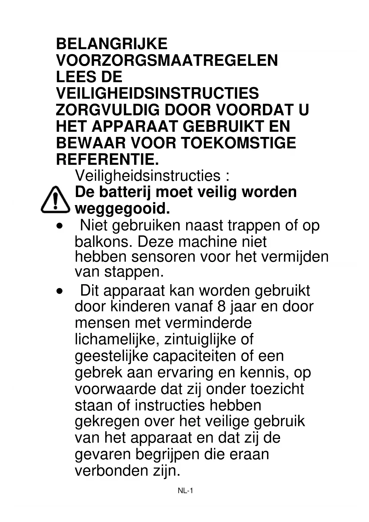 - Dit apparaat kan worden gebruikt door kinderen vanaf 8 jaar en door mensen met verminderde lichamelijke, zintuiglijke of geestelijke capaciteiten of een gebrek aan ervaring en kennis, op voorwaarde dat zij onder toezicht staan of instructies hebben gekregen over het veilige gebruik van het apparaat en dat zij de gevaren begrijpen die eraan verbonden zijn.NL-2