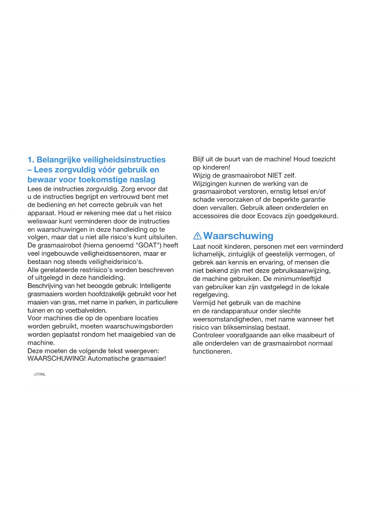 – Lees zorgvuldig vóór gebruik en bewaar voor toekomstige naslag Lees de instructies zorgvuldig Zorg ervoor dat u de instructies begrijpt en vertrouwd bent met de bediening en het correcte gebruik van het apparaat Houd er rekening mee dat u het risico weliswaar kunt verminderen door de instructies en waarschuwingen in deze handleiding op te volgen, maar dat u niet alle risico's kunt uitsluiten De grasmaairobot (hierna genoemd "GOAT") heeft veel ingebouwde veiligheidssensoren, maar er bestaan nog steeds veiligheidsrisico's Alle gerelateerde restrisico's worden beschreven of uitgelegd in deze handleiding Beschrijving van het beoogde gebruik: Intelligente grasmaaiers worden hoofdzakelijk gebruikt voor het maaien van gras, met name in parken, in particuliere tuinen en op voetbalvelden Voor machines die op de openbare locaties worden gebruikt, moeten waarschuwingsborden worden geplaatst rondom het maaigebied van de machine Deze moeten de volgende tekst weergeven: WAARSCHUWING! Automatische grasmaaier! Blijf uit de buurt van de machine! Houd toezicht op kinderen! Wijzig de grasmaairobot NIET zelf Wijzigingen kunnen de werking van de grasmaairobot verstoren, ernstig letsel en/of schade veroorzaken of de beperkte garantie doen vervallen Gebruik alleen onderdelen en accessoires die door Ecovacs zijn goedgekeurd Waarschuwing Laat nooit kinderen, personen met een verminderd lichamelijk, zintuiglijk of geestelijk vermogen, of gebrek aan kennis en ervaring, of mensen die niet bekend zijn met deze gebruiksaanwijzing, de machine gebruiken De minimumleeftijd van gebruiker kan zijn vastgelegd in de lokale regelgeving Vermijd het gebruik van de machine en de randapparatuur onder slechte weersomstandigheden, met name wanneer het risico van blikseminslag bestaat Controleer voorafgaande aan elke maaibeurt of alle onderdelen van de grasmaairobot normaal functioneren273 NL Inspecteer regelmatig het gebied waarin de machine gebruikt gaat worden en verwijder alle stenen, stokken, draden, botten en andere vreemde voorwerpen Laat kinderen NOOIT de netadapter, het laadstation, de maaimessen, het accuvak of enig onderdeel met openingen, zoals de wielen, aanraken Waarschuwing Gebruik de machine en/of randapparatuur nooit wanneer beschermkappen of schilden defect zijn, veiligheidsvoorzieningen ontbreken of de voedingskabel beschadigd of versleten is Blijf uit de buurt van de draaiende maaimessen! Plaats uw handen of voeten NIET onder of in de buurt van de roterende maaimessen Houd tijdens gebruik een veilige afstand tot de grasmaairobot Reik NIET te ver Houd altijd uw evenwicht en zorg dat u op hellingen altijd stevig staat Loop, en ren nooit, terwijl u de machine of randapparatuur bedient Waarschuwing Laat kinderen nooit in de buurt van de machine komen of met de machine spelen terwijl deze in gebruik is Waarschuwing Raak bewegende, gevaarlijke onderdelen NIET aan voordat deze volledig tot stilstand zijn gekomen Waarschuwing Gebruik voor het opladen van de accu alleen de afneembare netadapter die bij dit apparaat werd geleverd (CH2492E/CH2492F) Dit apparaat bevat een accu die alleen door vakmensen kan worden vervangen Veilig gebruik: Sluit geen beschadigde voedingskabel aan op de voeding en raak een beschadigde voedingskabel niet aan voordat deze is losgekoppeld van de voeding omdat een beschadigde voedingskabel kan leiden tot het aanraken van onderdelen die onder stroom staan Houd een verlengkabel uit de buurt van bewegende, gevaarlijke onderdelen om beschadiging van de verlengkabel te voorkomen, wat kan leiden tot het aanraken van onderdelen274NL die onder stroom staan Sluit de machine en/of randapparatuur alleen aan op een netstroomcircuit dat wordt beveiligd door een aardlekschakelaar (RCD) met een uitschakelstroom van maximaal 30