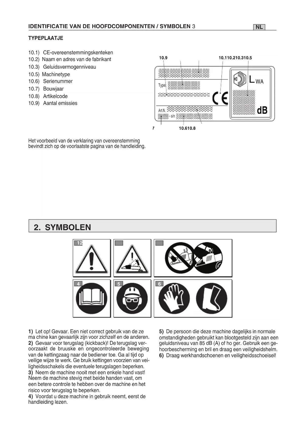 2) Gevaar voor terugslag (kickback)! De terugslag veroorzaakt de bruuske en ongecontroleerde beweging van de kettingzaag maar de bediener toe. Ga alijd op veilige wijze te werk. GeBruik kettingen voorzien van veilheidsschakels die eventuele terugslagen beperken.