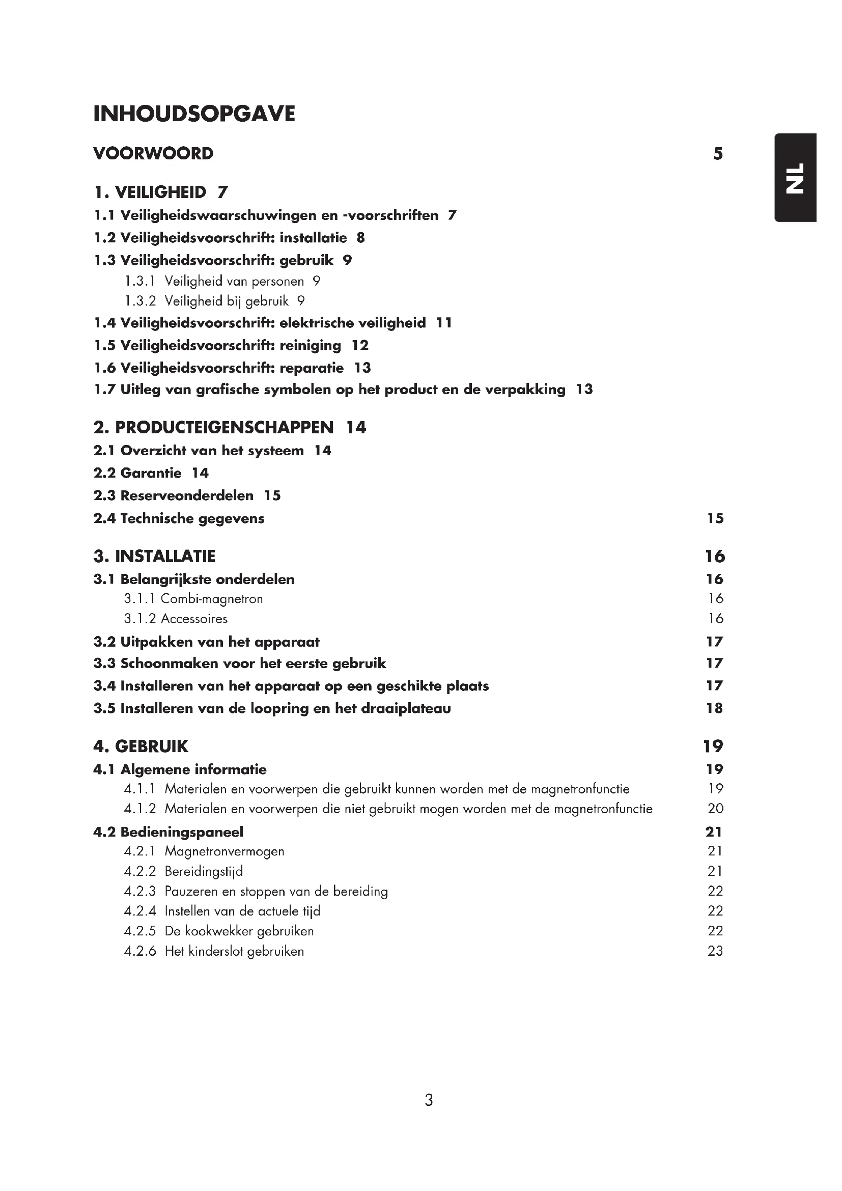 WAARSCHUWING! Laat de combi-magnetron nooit werken zonder voedsel (eten of drinken) in de ovenruimte om oververhitting te voorkomen. Laat de combi-magnetron nooit werken zonder loopring en draaiplateau. Kijk voor de bereidingswijze en bereidingstijd altijd op de verpakking van het voedsel en volg de instructies van de producent. Houd bij de verschillende bereidingswijzen rekening met de gebruikte materialen en gebruiksvoorwerpen. Gebruik enkel materialen en gebruiksvoorwerpen die geschikt zijn voor de gekozen bereidingswijze(n).