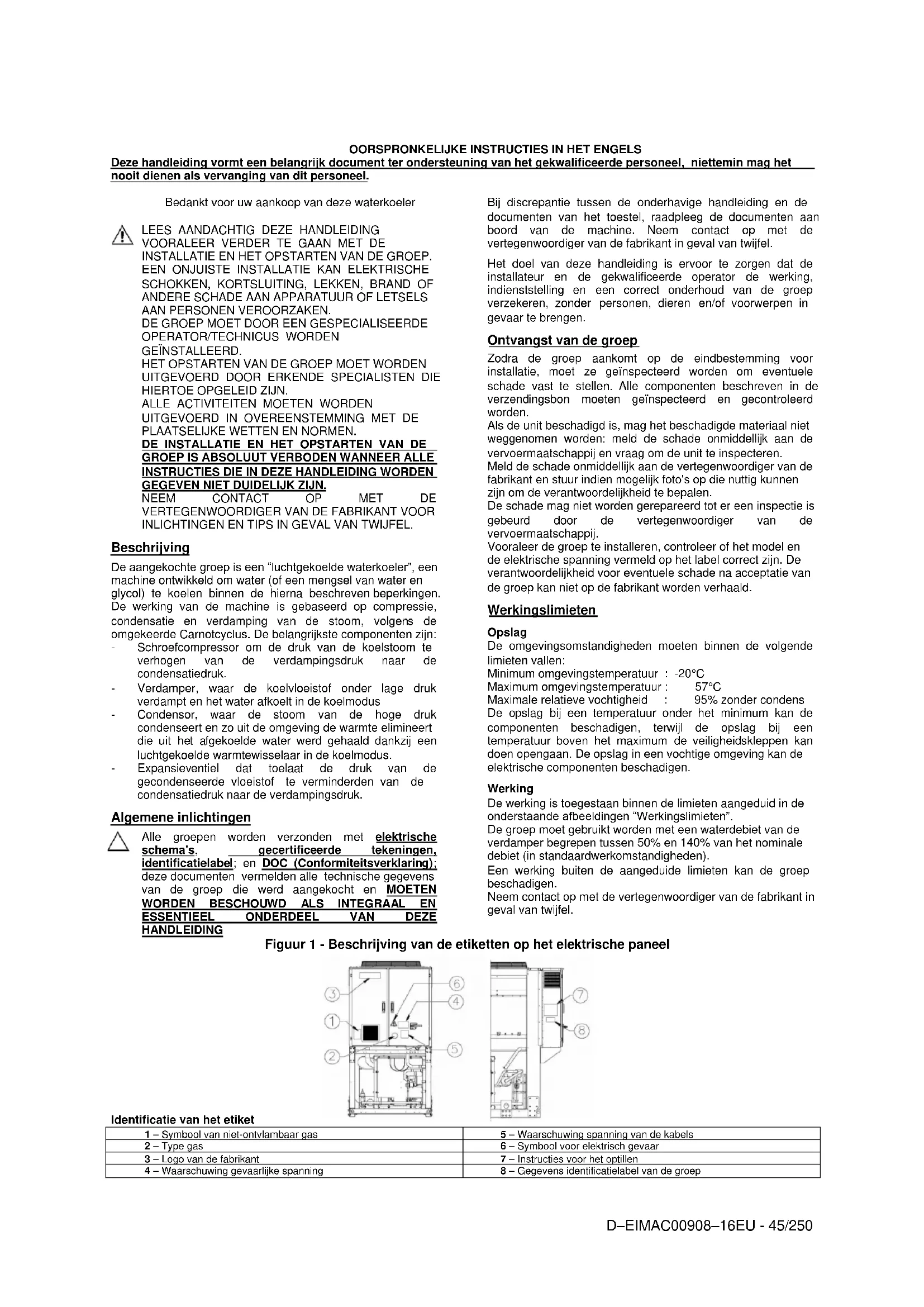 Het doel van deze handleiding is ervoor te zorgen dat de installateur en de gekwalificeerde operator de werking, indienststelling en een correct onderhoud van de groep verzekeren, zonder personen, dieren en/of voorwerpen in gevaar te brengen. Ontvangst van de groep Zodra de groep aankomt op de eindbestemming voor installatie, moet ze geïnspecteerd worden om eventuele schade vast te stellen. Alle componenten beschreven in de verzendingsbon moeten geïnspecteerd en gecontroleerd worden. Als de unit beschadigd is, mag het beschadigde materiaal niet weggenomen worden: meld de schade onmiddellijk aan de vervoermaatschappij en vraag om de unit te inspecteren. Meld de schade onmiddellijk aan de vertegenwoordiger van de fabrikant en stuur indien mogelijk foto's op die nuttig kunnen zijn om de verantwoordelijkheid te bepalen. De schade mag niet worden gerepareerd tot er een inspectie is gebeurd door de vertegenwoordiger van de vervoermaatschappij. Vooraleer de groep te installeren, controleer of het model en de elektrische spanning vermeld op het label correct zijn. De verantwoordelijkheid voor eventuele schade na acceptatie van de groep kan niet op de fabrikant worden verhaald. Werkingslimieten Opslag De omgevingsomstandigheden moeten binnen de volgende limieten vallen: Minimum omgevingstemperatuur : -20°C Maximum omgevingstemperatuur : 57°C Maximale relatieve vochtigheid : 95% zonder condens De opslag bij een temperatuur onder het minimum kan de componenten beschadigen, terwijl de opslag bij een temperatuur boven het maximum de veiligheidskleppen kan doen opengaan. De opslag in een vochtige omgeving kan de elektrische componenten beschadigen. Werking De werking is toegestaan binnen de limieten aangeduid in de onderstaande afbeeldingen “Werkingslimieten”. De groep moet gebruikt worden met een waterdebiet van de verdamper begrepen tussen 50% en 140% van het nominale debiet (in standaardwerkomstandigheden). Een werking buiten de aangeduide limieten kan de groep beschadigen. Neem contact op met de vertegenwoordiger van de fabrikant in geval van twijfel. Figuur 1 - Beschrijving van de etiketten op het elektrische paneel