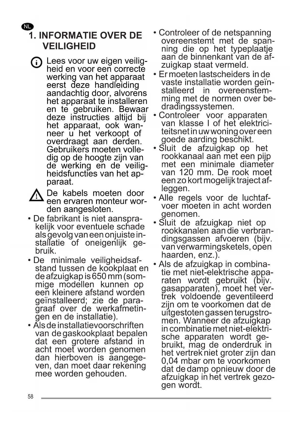 - Als de afzuigkap in combina- tie met niet-elektrische appa- raten wordt gebruikt (bijv. gasapparaten), moet het ver- trek voldoende geventileerd zijn om te voorkomen dat de uitgestoten gassen terugstro- men. Wanneer de afzuigkap in combinatie met niet-elektri- sche apparaten wordt ge- bruikt, mag de onderdruk in het vertrek niet groter zijn dan 0,04 mbar om te voorkomen dat de damp opnieuw door de afzuigkap in het vertrek gezo- gen wordt. 58• De lucht mag niet worden af- gevoerd door een kanaal dat wordt gebruikt voor de rook- gasafvoer door apparaten op gas of andere brandstoffen.