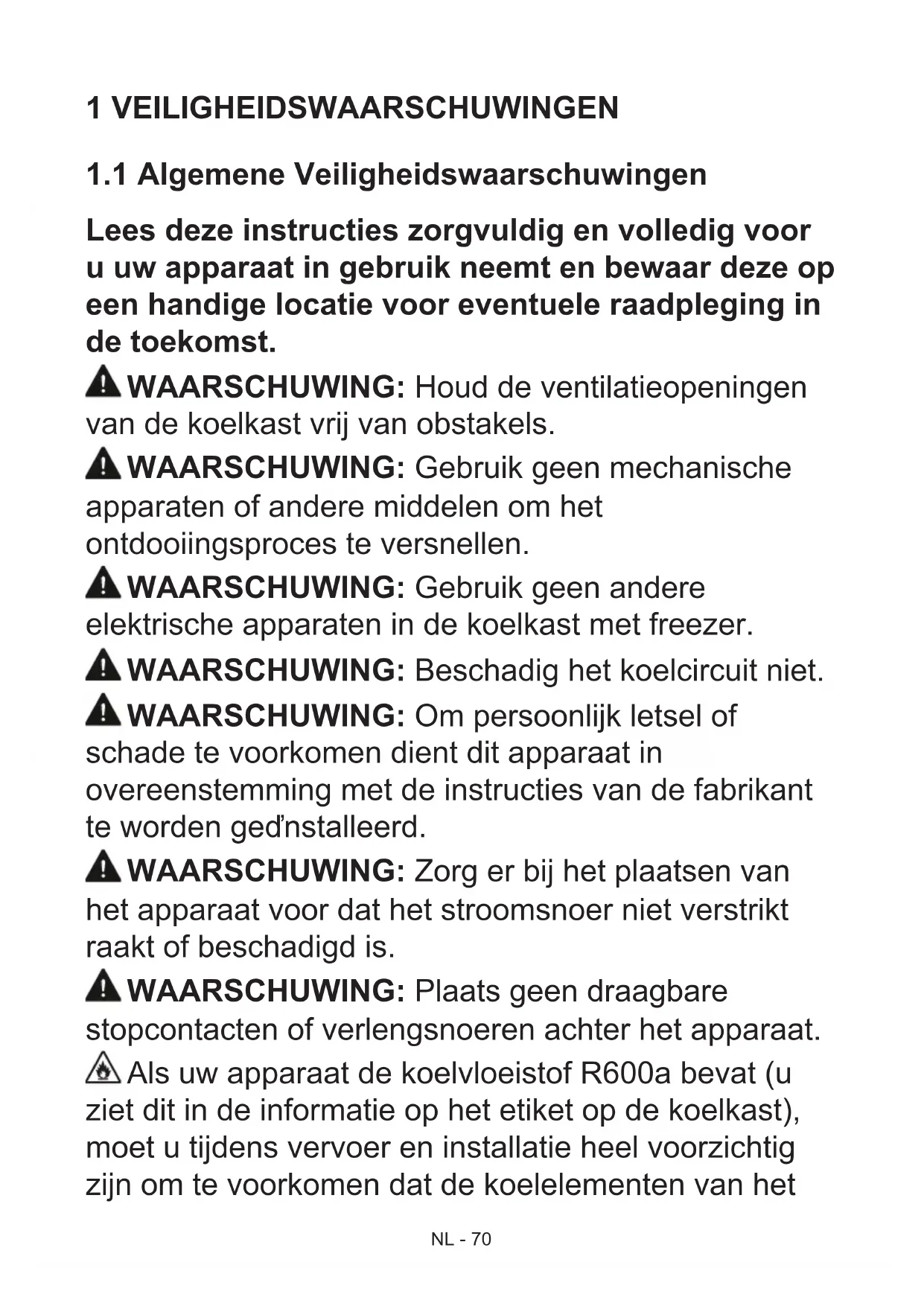 Lees deze instructies zorgvuldig en volledig voor u uw apparaat in gebruik neemt en bewaar deze op een handige locatie voor eventuele raadpleging in de toekomst. WAARSCHUWING: Houd de ventilatieopeningen van de koelkast vrij van obstakels. WAARSCHUWING: Gebruik geen mechanische apparaten of andere middelen om het ontdooiingsproces te versnellen. WAARSCHUWING: Gebruik geen andere elektrische apparaten in de koelkast met freezer. WAARSCHUWING: Beschadig het koelcircuit niet. WAARSCHUWING: Om persoonlijk letsel of schade te voorkomen dient dit apparaat in overeenstemming met de instructies van de fabrikant te worden geďnstalleerd. WAARSCHUWING: Zorg er bij het plaatsen van het apparaat voor dat het stroomsnoer niet verstrikt raakt of beschadigd is. WAARSCHUWING: Plaats geen draagbare stopcontacten of verlengsnoeren achter het apparaat. Als uw apparaat de koelvloeistof R600a bevat (u ziet dit in de informatie op het etiket op de koelkast), moet u tijdens vervoer en installatie heel voorzichtig zijn om te voorkomen dat de koelelementen van hetNL - 71 apparaat beschadigen. R600a is wel een milieuvriendelijk en natuurlijk gas. Maar omdat het explosief is, moet u de ruimte waar het apparaat wordt geplaatst een paar minuten ventileren en open vuur weg houden, voor het geval dat door beschadiging van de koelelementen gas lekt.