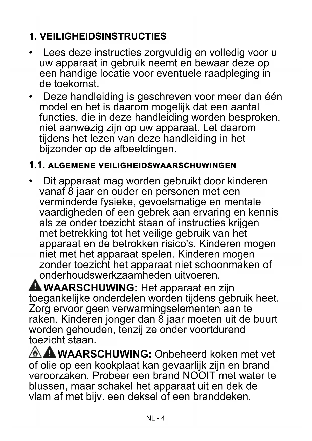 - Dit apparaat mag worden gebruikt door kinderen vanaf 8 jaar en ouder en personen met een verminderde fysieke, gevoelsmatige en mentale vaardigheden of een gebrek aan ervaring en kennis als ze onder toezicht staan of instructies krijgen met betrekking tot het veilige gebruik van het apparaat en de betrokken risico's. Kinderen mogen niet met het apparaat spelen. Kinderen mogen zonder toezicht het apparaat niet schoonmaken of onderhoudswerkzaamheden uitvoeren. WAARSCHUWING: Het apparaat en zijn toegankelijke onderdelen worden tijdens gebruik heet. Zorg ervoor geen verwarmingselementen aan te raken. Kinderen jonger dan 8 jaar moeten uit de buurt worden gehouden, tenzij ze onder voortdurend toezicht staan. WAARSCHUWING: Onbeheerd koken met vet of olie op een kookplaat kan gevaarlijk zijn en brand veroorzaken. Probeer een brand NOOIT met water te blussen, maar schakel het apparaat uit en dek de vlam af met bijv. een deksel of een branddeken.NL - 5 LET OP: Op het bereidingsproces moet worden toegezien. Op een kort bereidingsproces moet voortdurend worden toegezien. WAARSCHUWING: Brandgevaar: bewaar geen voorwerpen op de kookoppervlakken. WAARSCHUWING: Als het oppervlak gebarsten is, moet u het apparaat uitschakelen om het risico op elektrische schokken te voorkomen.